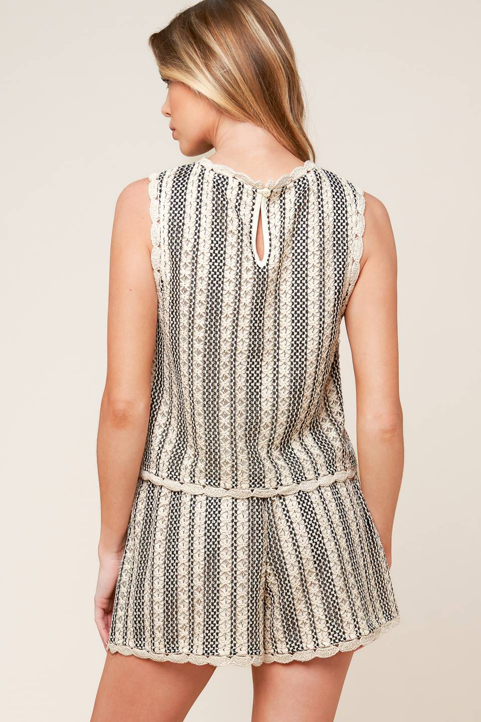 A crochet lace top and shorts set. Top featuring round neckline with lace edge, sleeveless and back neck button closure. Soft shorts with elasticized waist with lace hemline