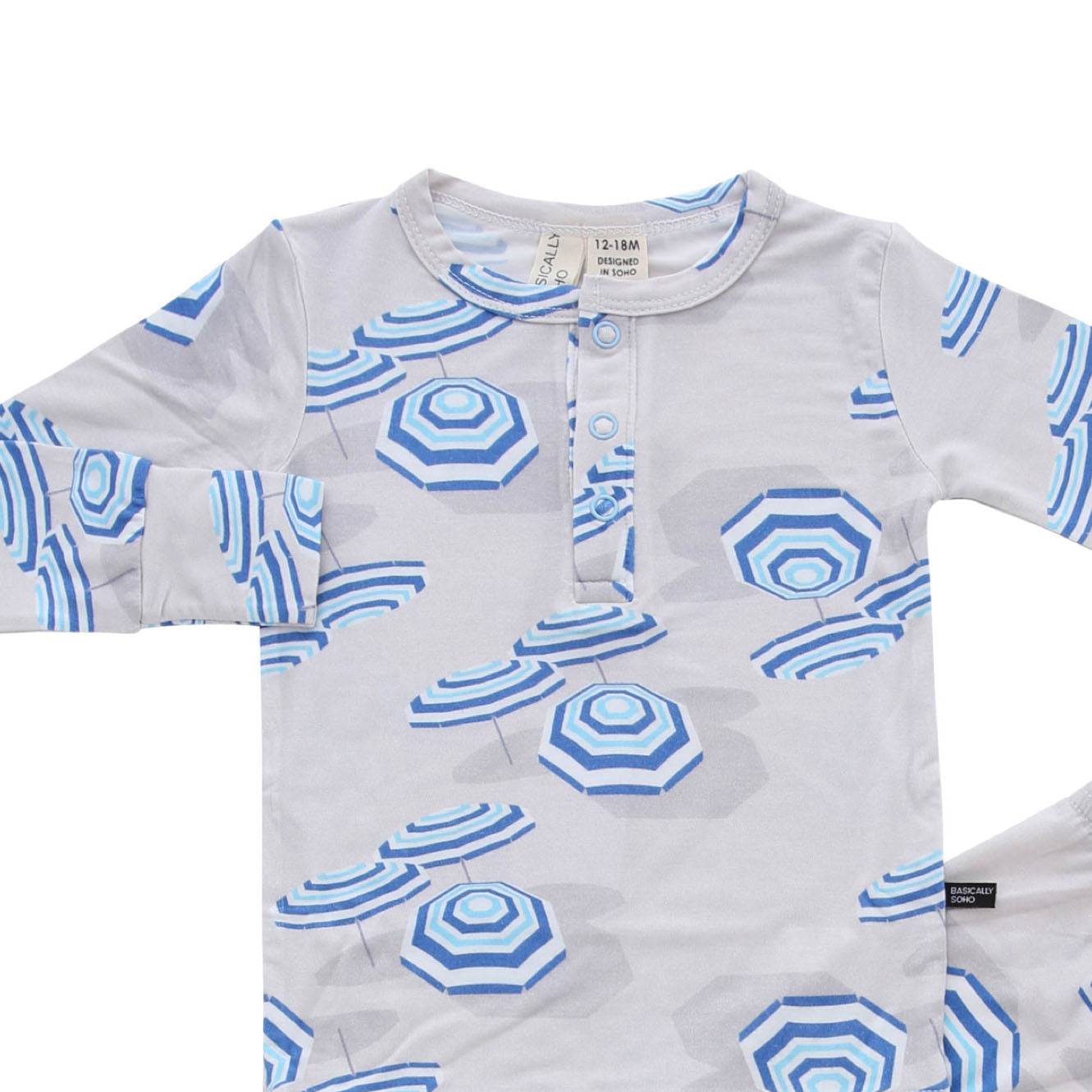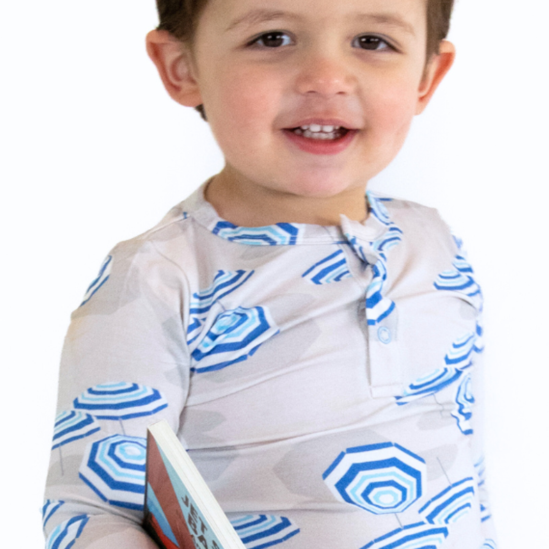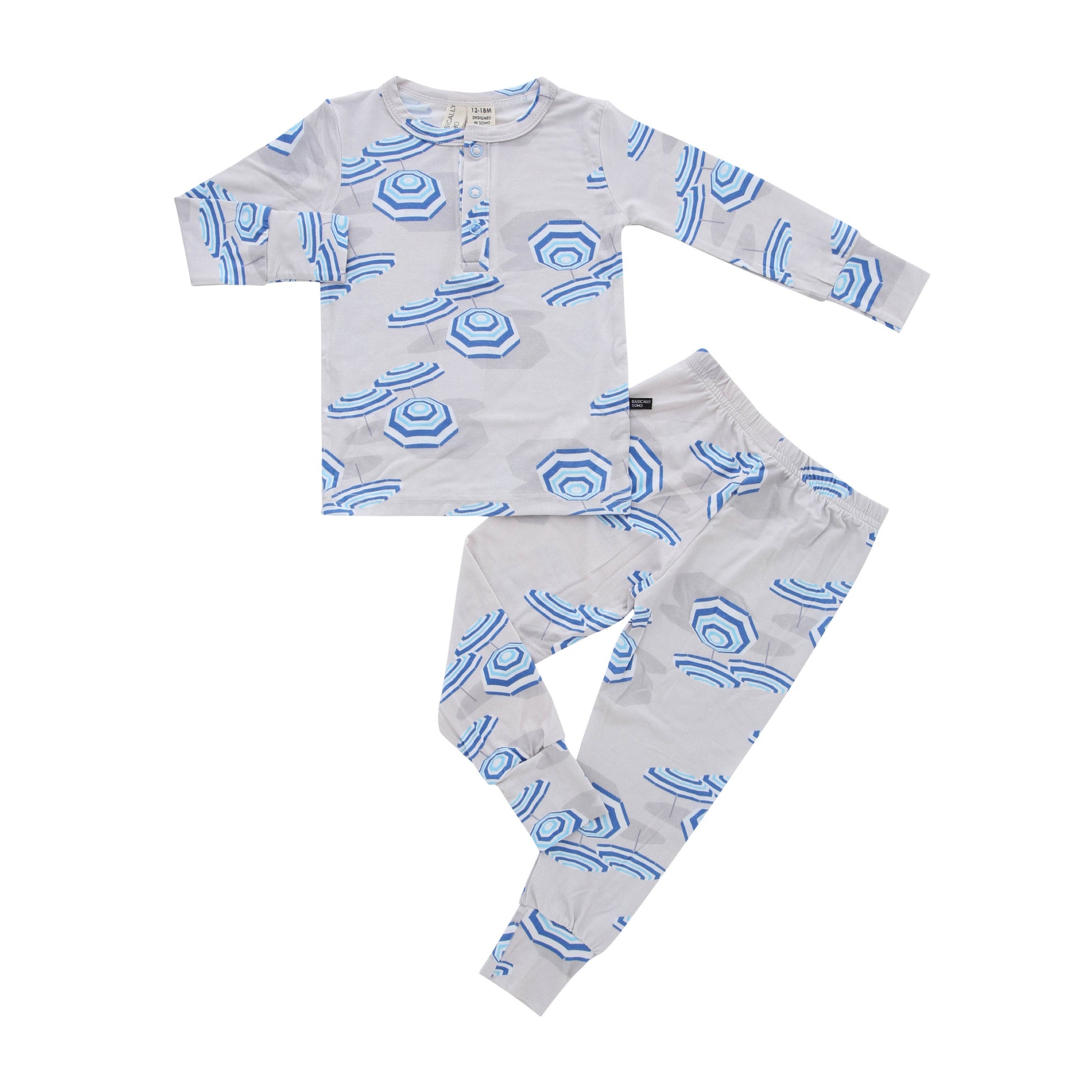 Upgrade your toddler's sleepwear with our super soft bamboo two-piece set! Our Beach Club Navy Gray pajama set is inspired by the iconic blue and white beach umbrella print of Fontelina beach club in Capri, Italy. This color combination is perfect for the toddler boy or the Italy/beach lover in your life! A classic color combo and a great gift, give the gift of a good night's sleep!