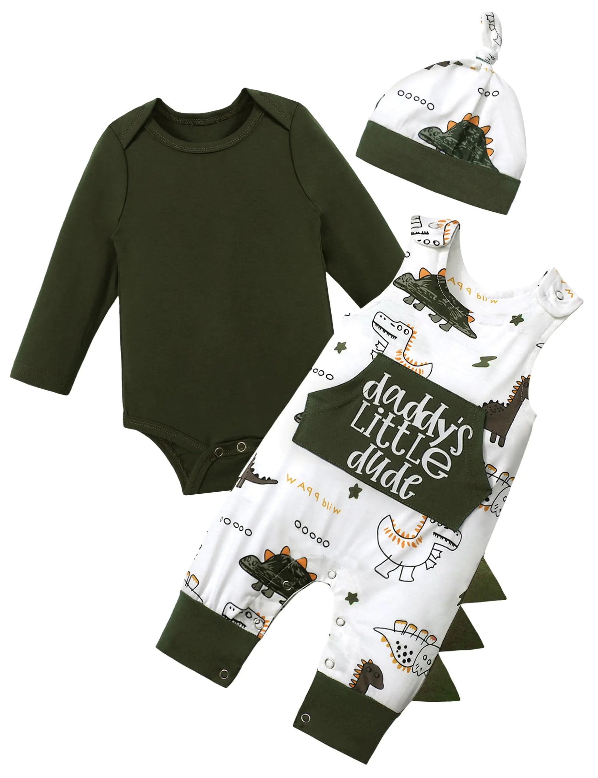 Featuring a long-sleeve green romper adorned with playful dinosaur prints, cozy overalls, and a matching hat, this set keeps your baby warm and adorable.