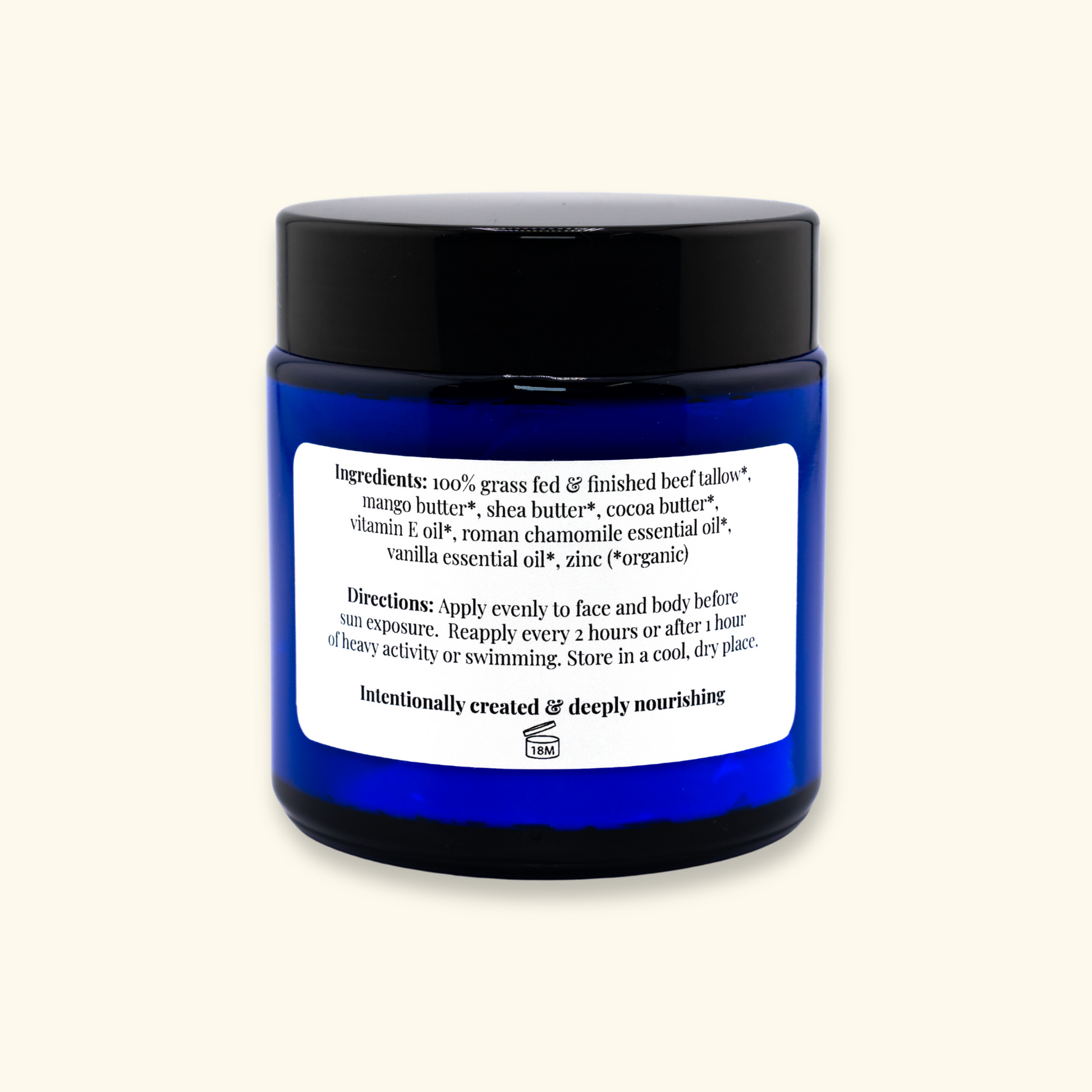 Ingredients: 100% grass fed & finished beef tallow*, mango butter*shea butter*, cocoa butter*, vitamin E oil*, Roman chamomile essential oil*vanilla essential oil*, zinc (*organic)