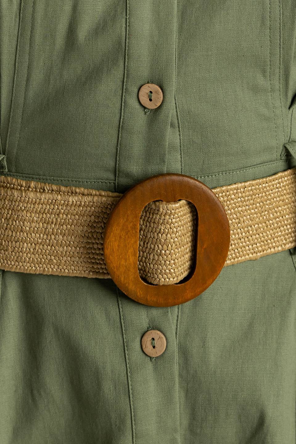 A solid olive woven midi dress featuring collar, short cuffed sleeve, button down, contrasting belt, side pockets and full skirt.