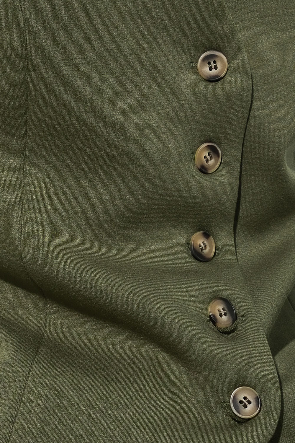 A ponti knit vest featuring V neckline, sleeveless and button down. Matching Bottom FP1013