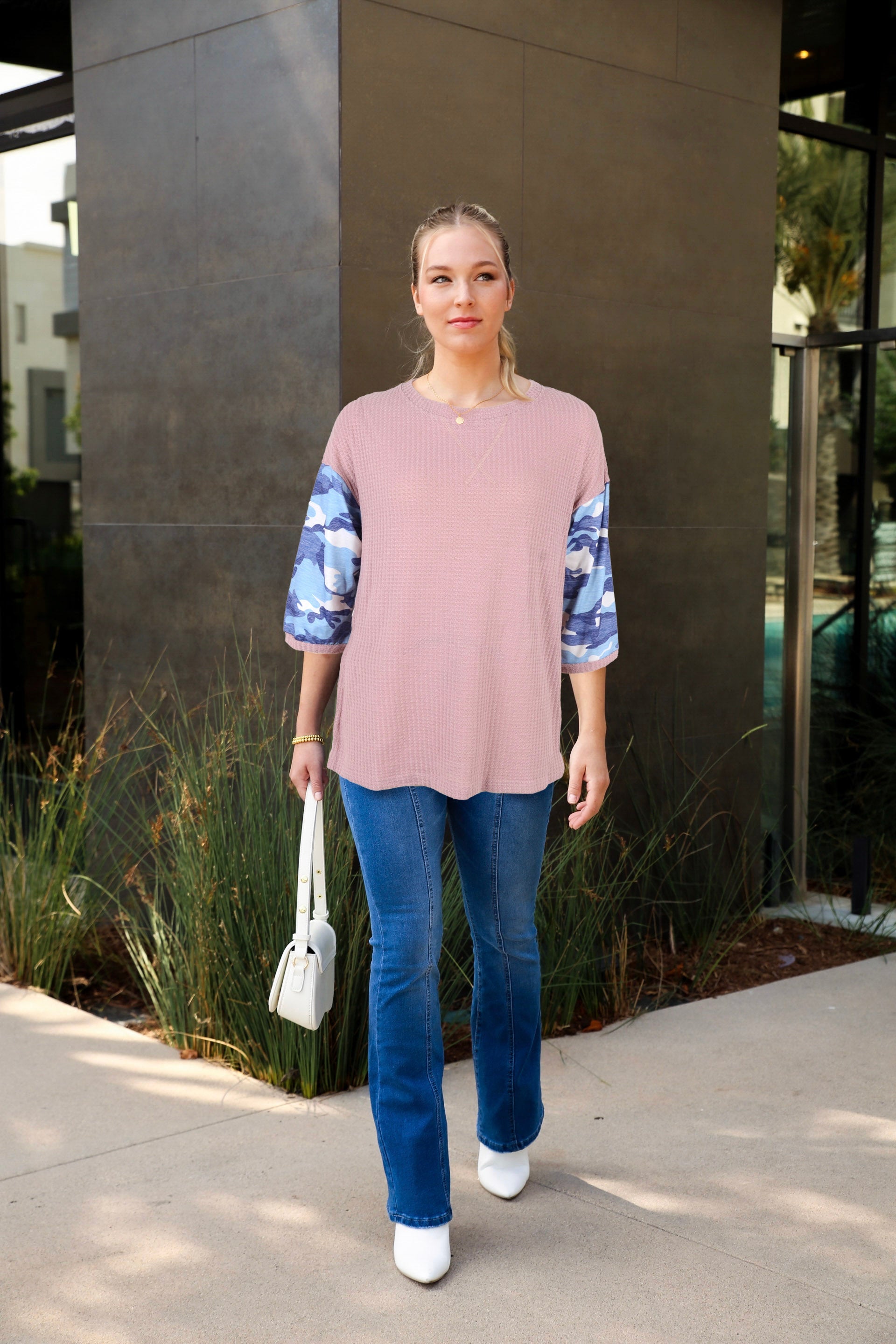 The Anna-Kaci sweater is detailed with a fun camouflage panel on the sleeves and back of the sweater. Features a round neck that can be worn asymmetrical on one shoulder, 3/4 length sleeves, waffle knit material, and an oversized fit. Style it with denim shorts and your favorite pair of sunnies for a casual outdoor look.