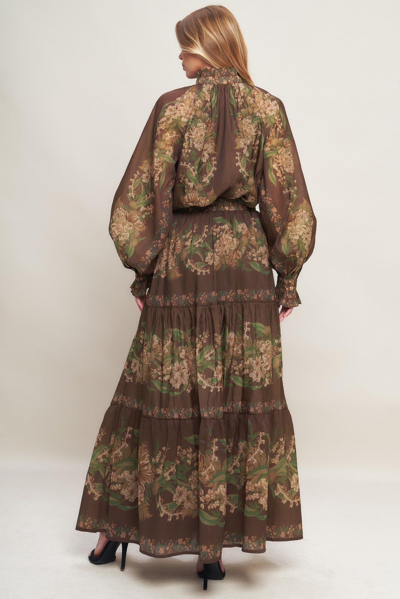 A printed woven maxi skirt featuring elasticized waist and tiers. Matching top IT13889