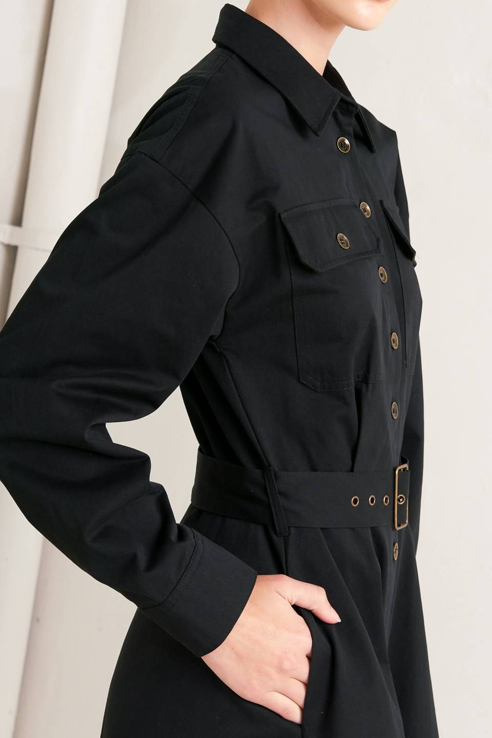 A solid woven midi dress featuring shirt collar, pockets, long sleeve, button down, self belt and full skirt