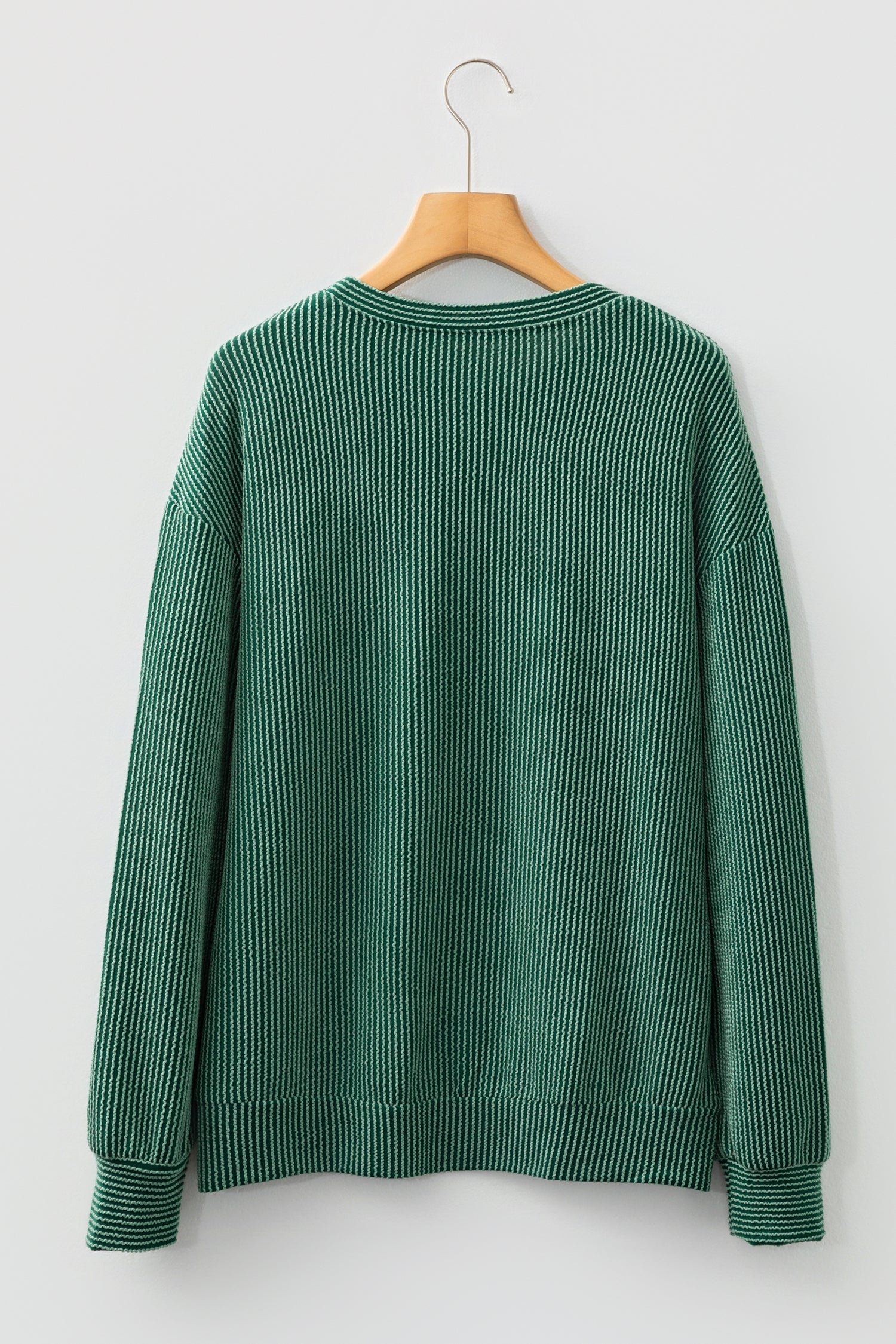 Celebrate the festive season in style with this top. Its baggy fit and dropped shoulder design flatter all shapes, while the classic round neck adds timeless charm. Crafted from quality fabric with a trendy twisted rib texture, this playful top brings cozy comfort and holiday cheer to your wardrobe. Perfect for spreading merry vibes wherever you go! Polyester/Viscose/Spandex