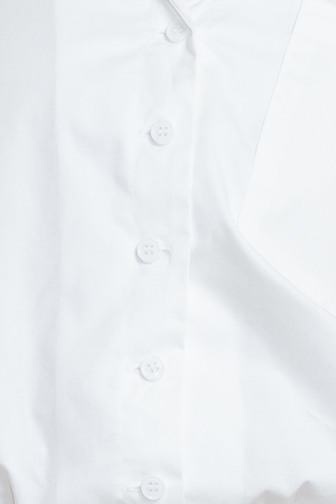 A woven crop top featuring contrasting collar, button down and waist drawstring.