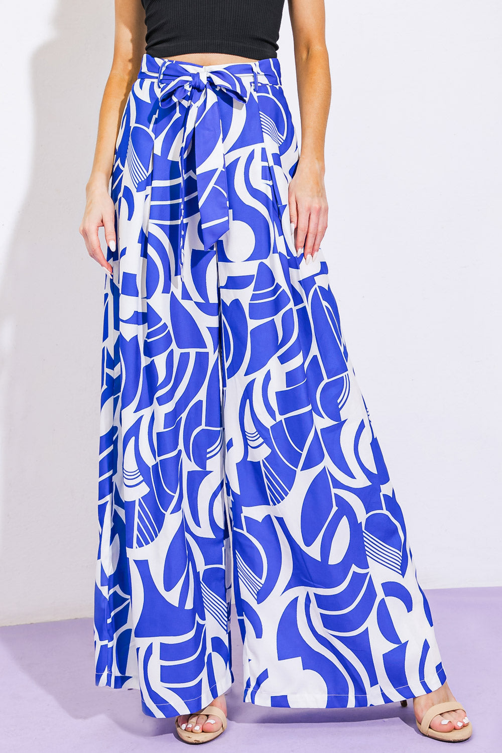 A printed woven pant featuring front closure, self sash tie and wide leg. Matching top IT13031