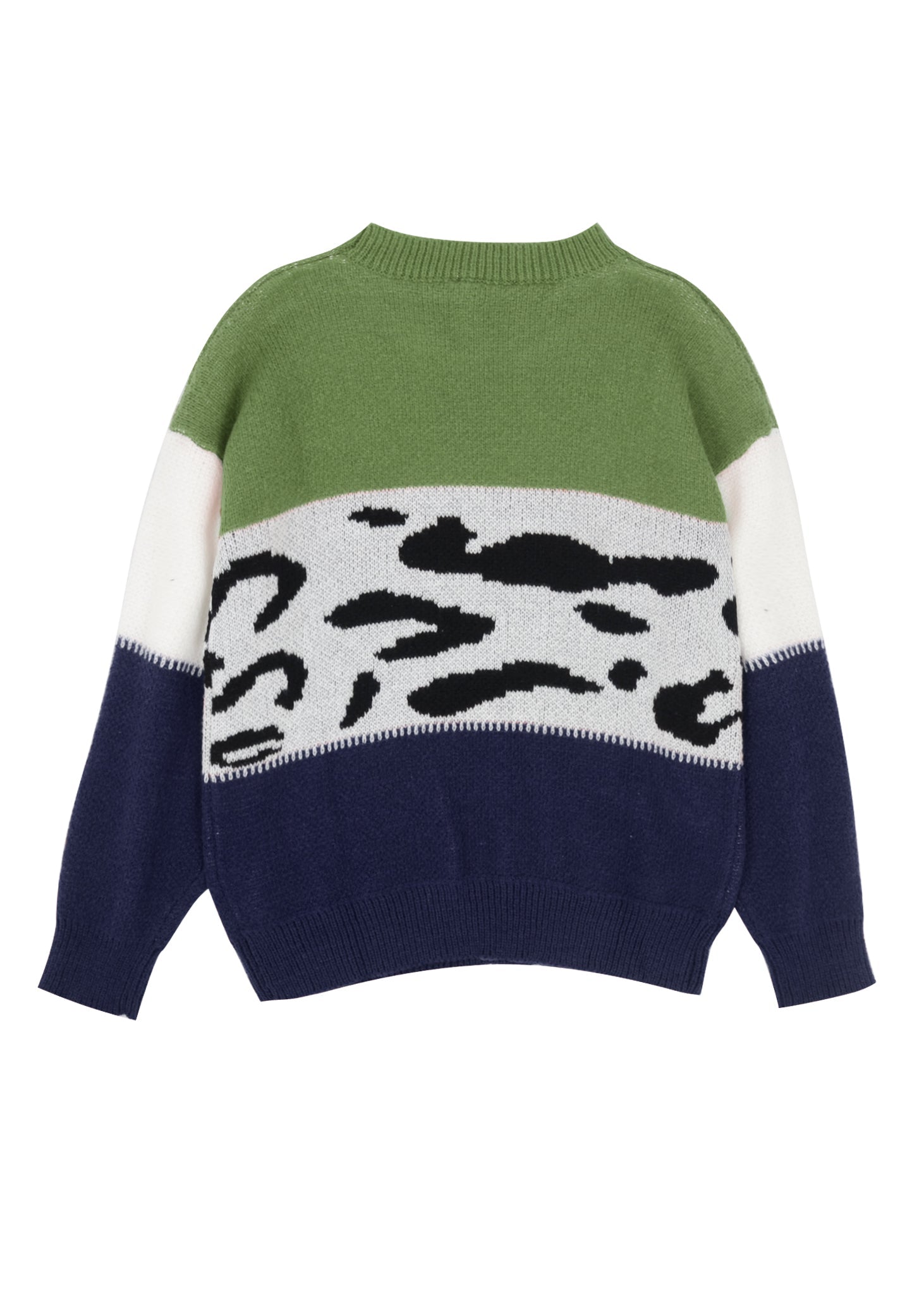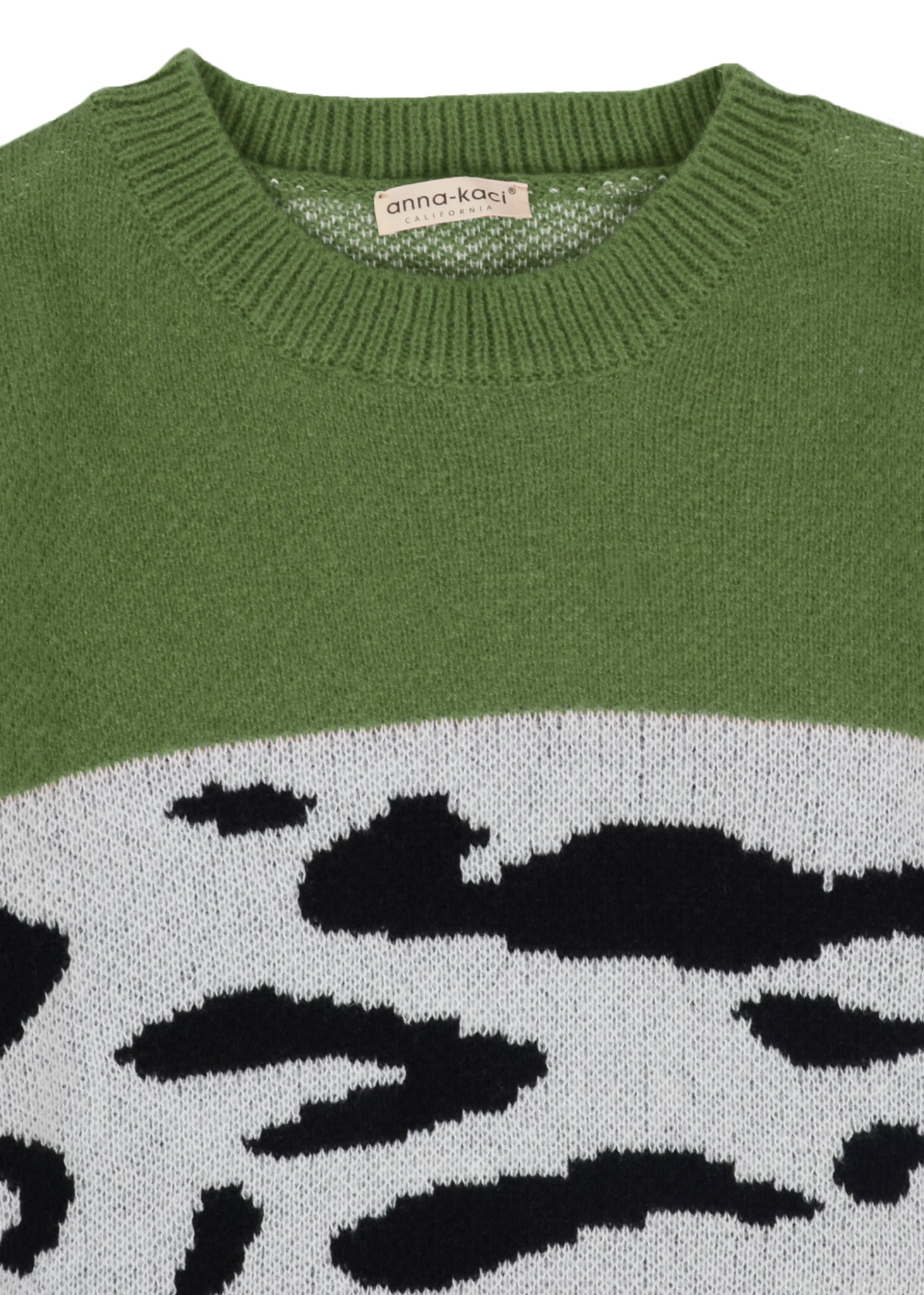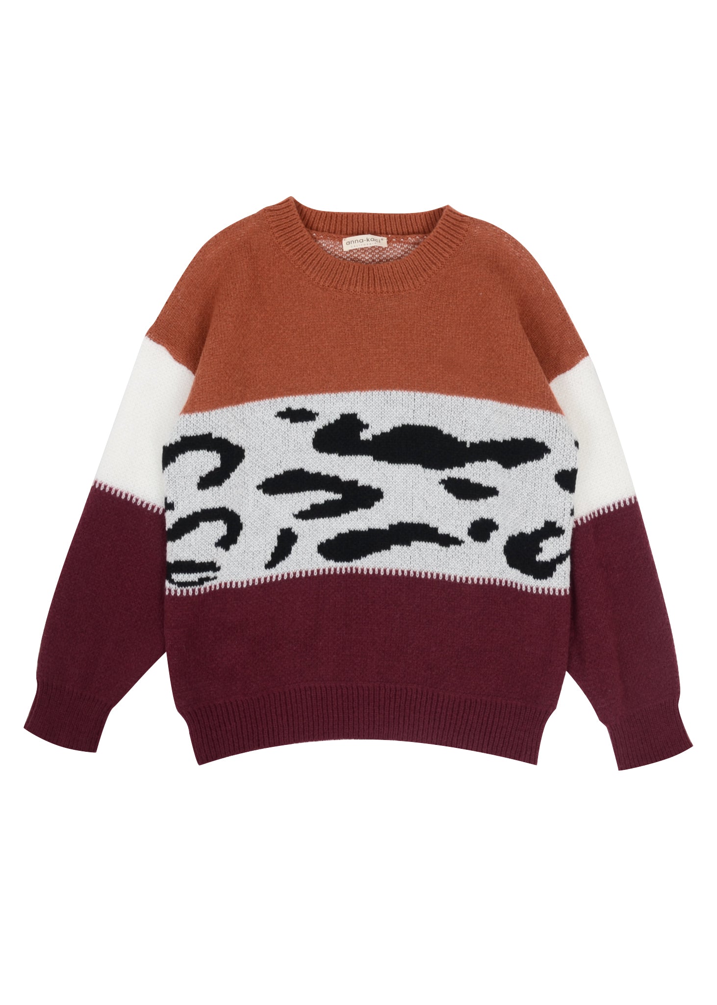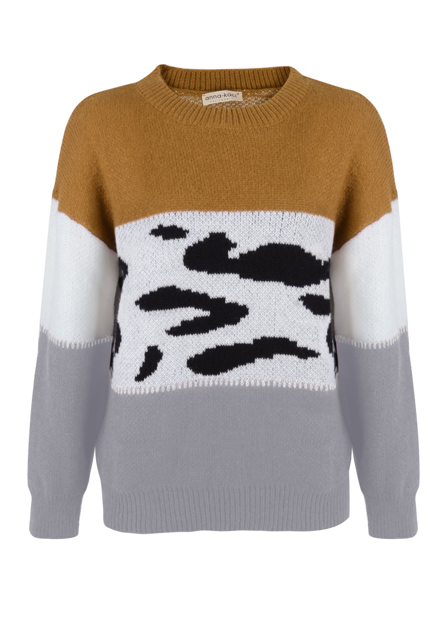 The Anna-Kaci sweater is detailed with bold color block details with animal prints on the middle. Features a round neck line, long sleeves, knit material, and relaxed fit. Pair it with denim shorts and sneakers for a fun look this season.