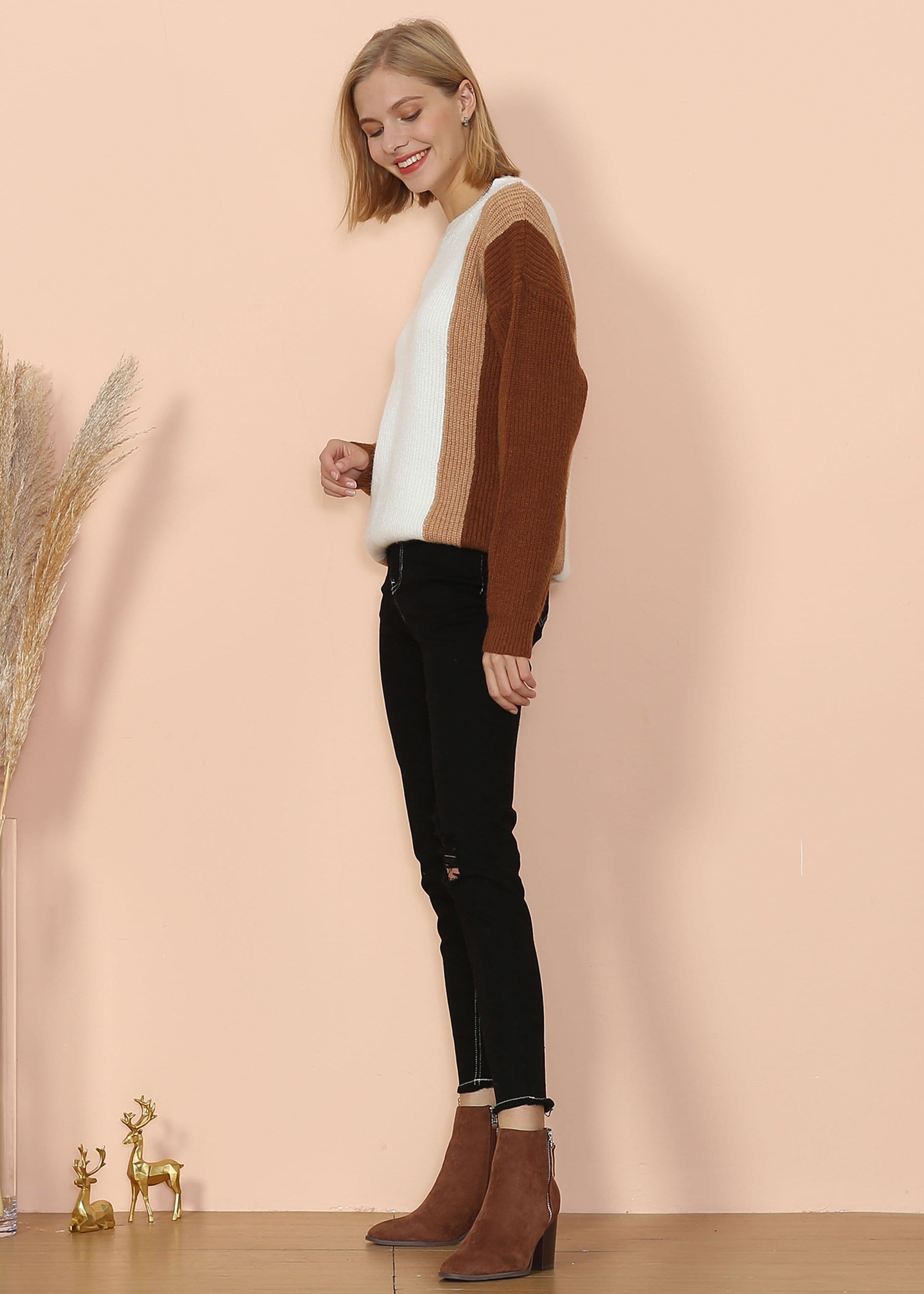 The Anna-Kaci knit sweater is detailed with eye-catching color blocking details on the side and sleeves of the sweater. Features a round neck, long sleeves, and relaxed fit. Pair it with leather leggings and combat boots for the perfect fall look.