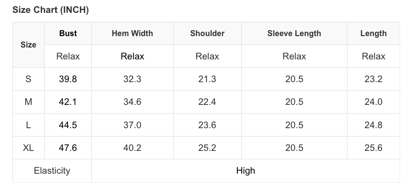 See size chart for approximate measurements