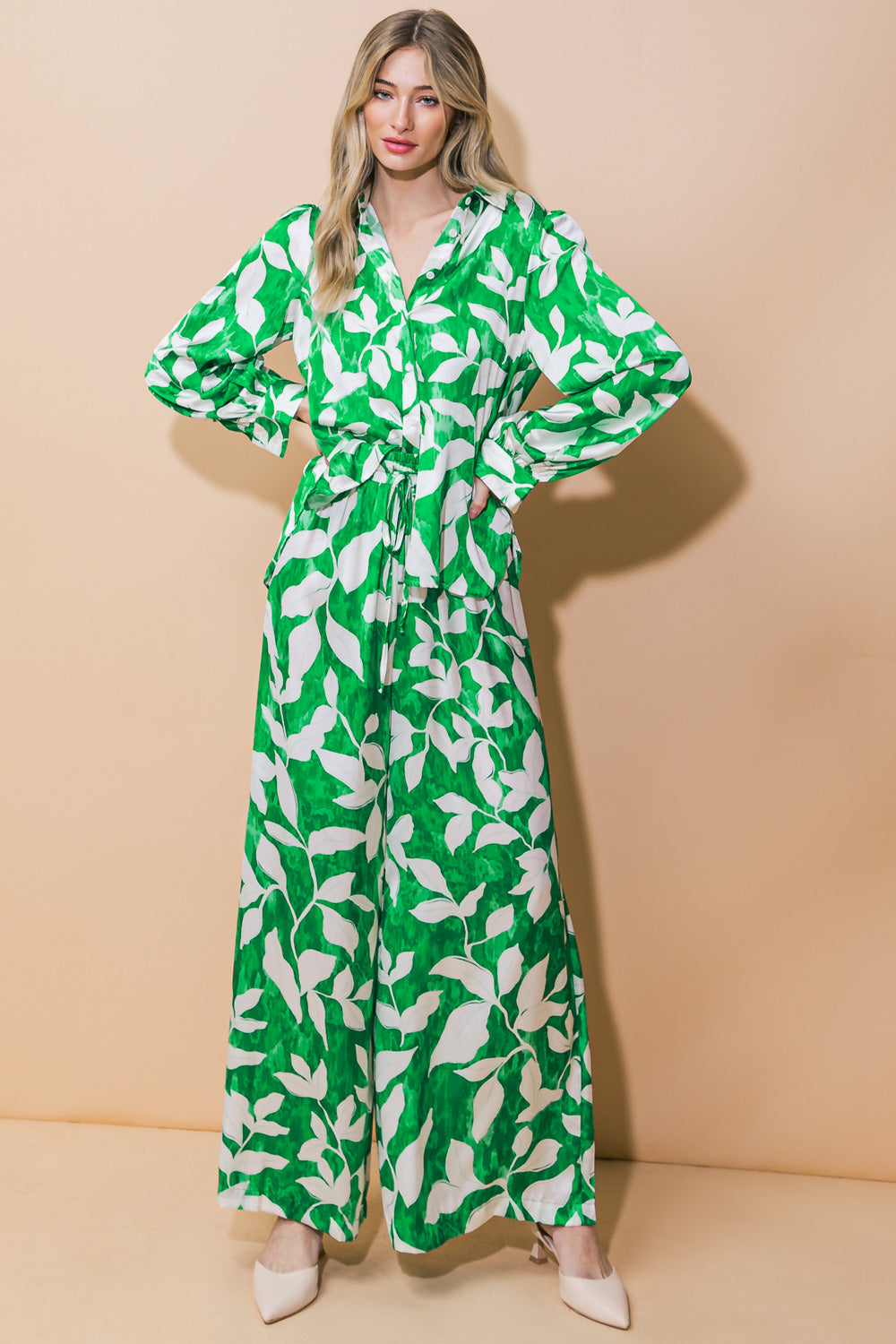 An exquisitely crafted woven pant, adorned with an elasticized waistband complete with a tasteful tacked tie and flowing wide leg design.