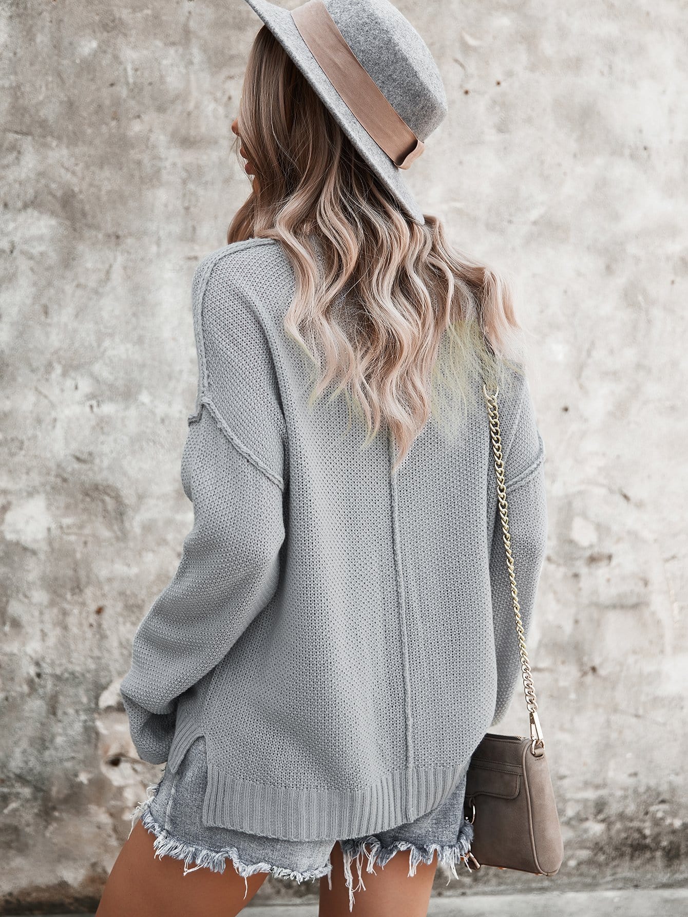 The Anna-Kaci sweater is detailed with beautiful textured knit. Features a round neck line, contrast half button front, outer edge seams, long sleeves, and loose fit. Pair it with distressed shorts and sneakers for a fun look.