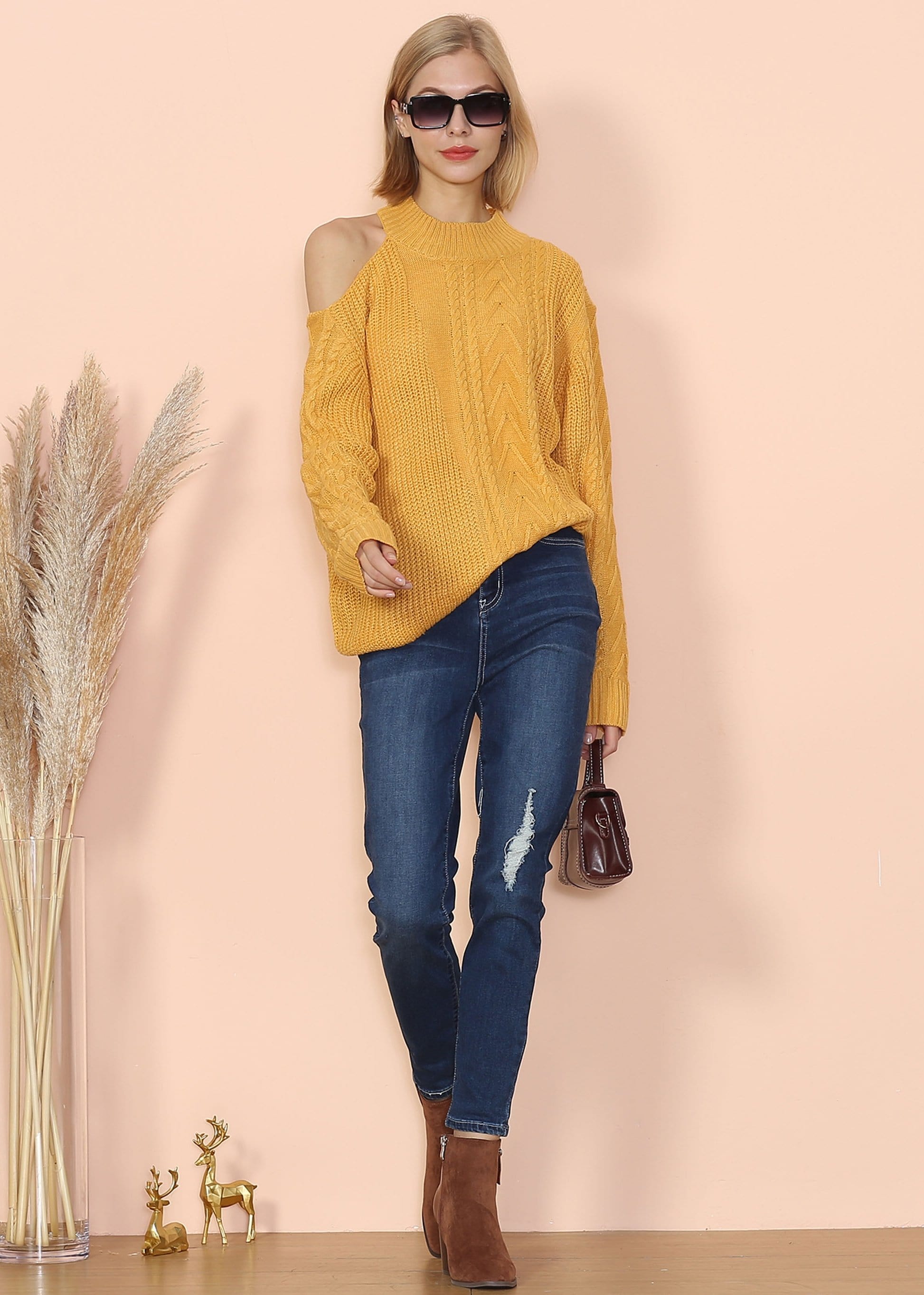 The Anna-Kaci cable knit sweater is detailed with a?gorgeous one-shoulder cut out. Features an easy high round?neck line, drop shoulder, and?relaxed?loose fit. Pair it with your favorite denim jeans for a comfortable fall look.