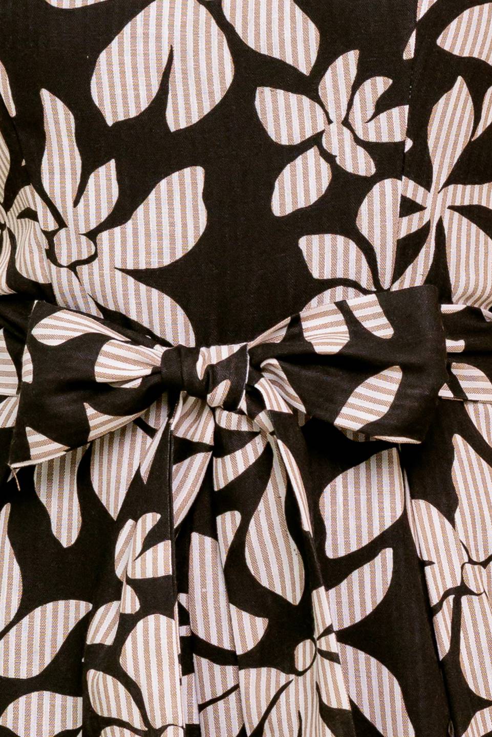 A printed woven jumpsuit featuring strapless neckline with ric rac trimmed edge, self sash tie, wide leg and back zipper closure.