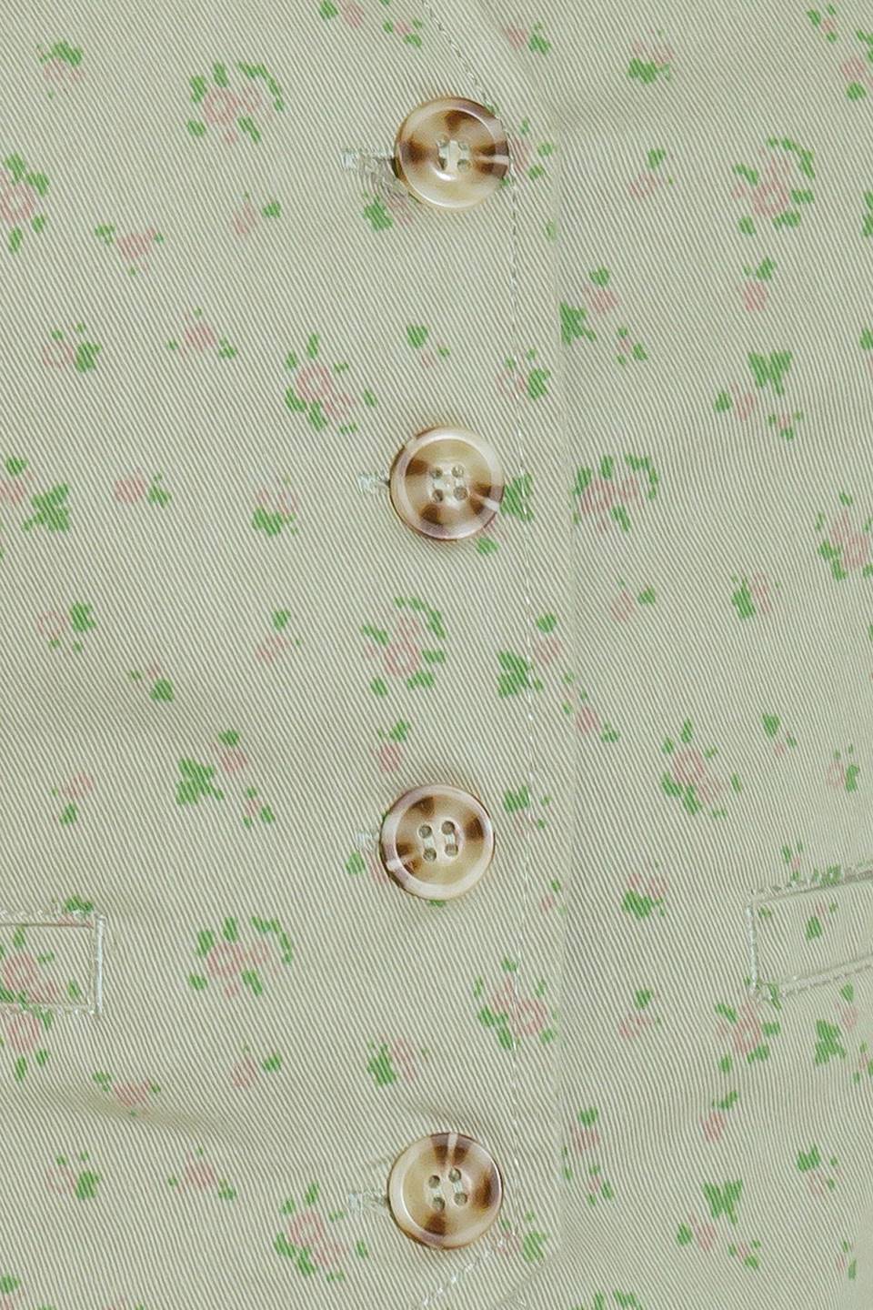 A printed woven vest featuring sleeveless and front button down.