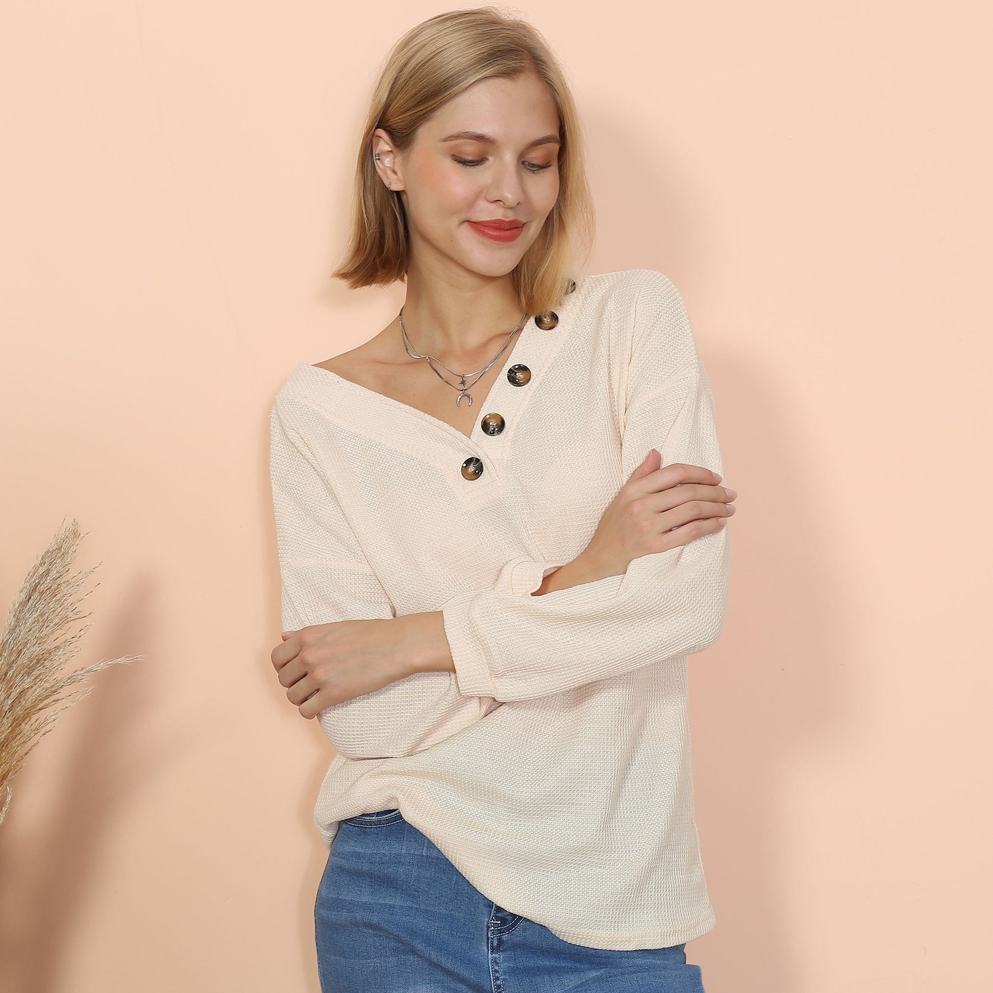 The Anna-Kaci sweater is detailed with a cozy textured knit material. Features a v neck line, drop shoulder, faux buttons, long sleeves, and loose fit. Pair it with denim jeans and pointed boots for a casual fall look.