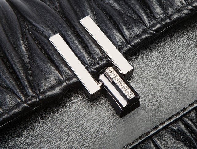 Small crossbody purse with lock closure and pewter fittings.