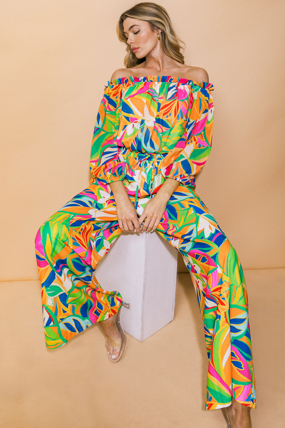 A printed woven top featuring on/off shoulder neckline, long sleeve and elasticized waist.