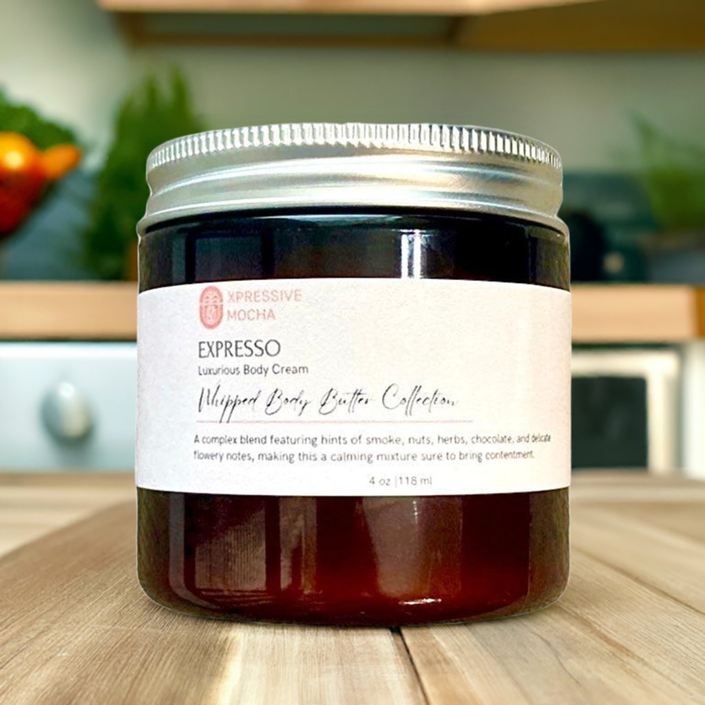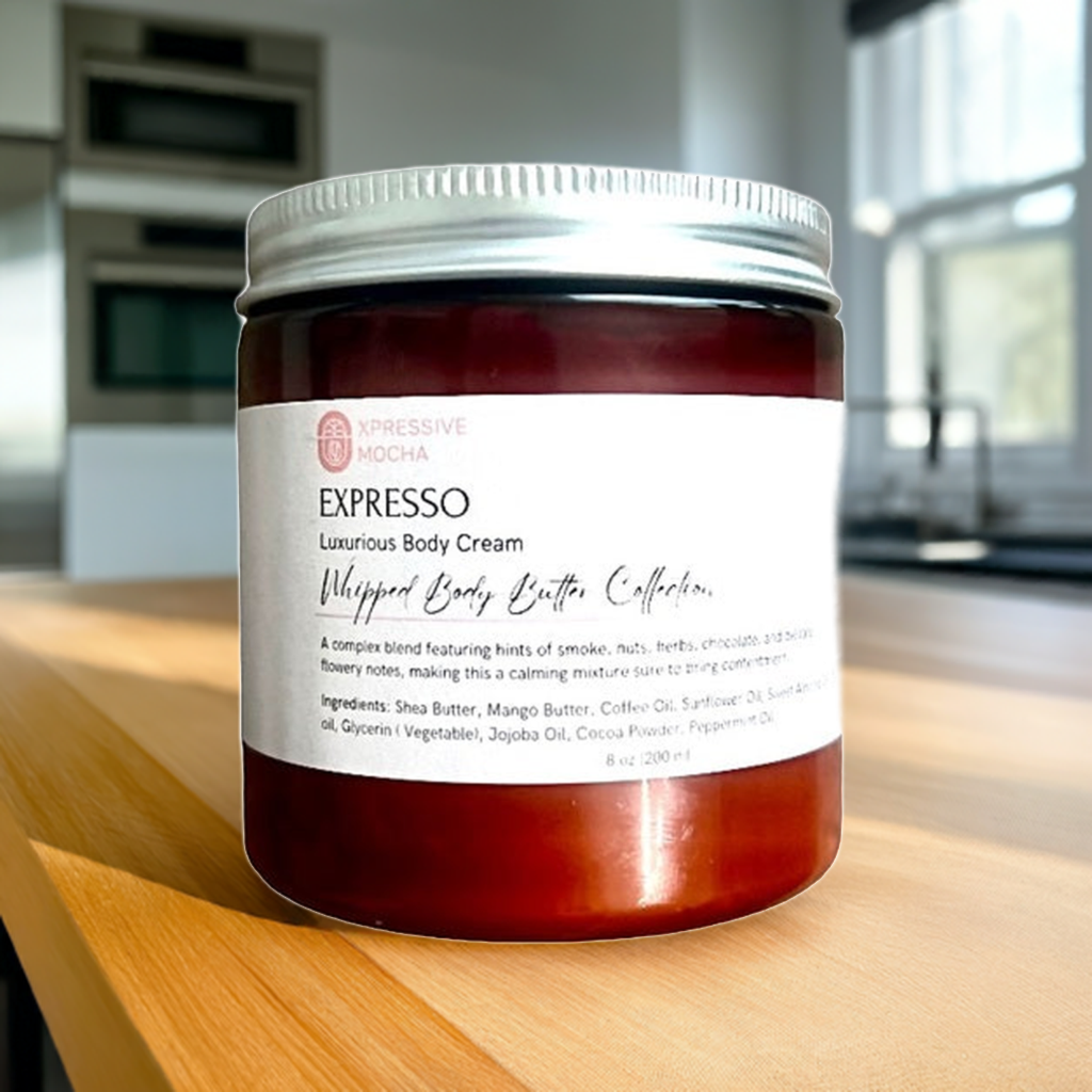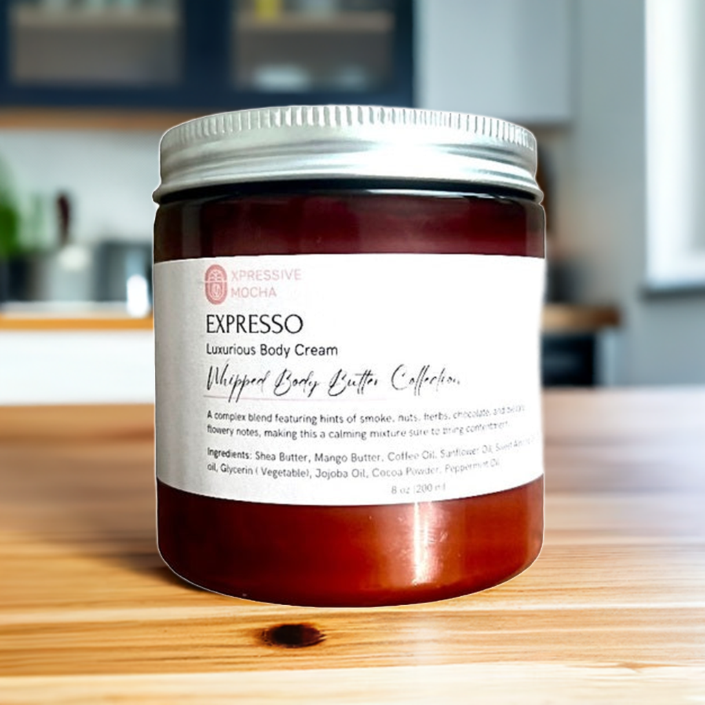 Ingredients: Shea Butter, Mango Butter, Coffee Oil, Sunflower Oil, Sweet Almond Oil, Olive oil, Glycerin ( Vegetable), Jojoba Oil, Cocoa Powder, Peppermint Oil, Arrowroot Powder and Phthalate-free fragrance.