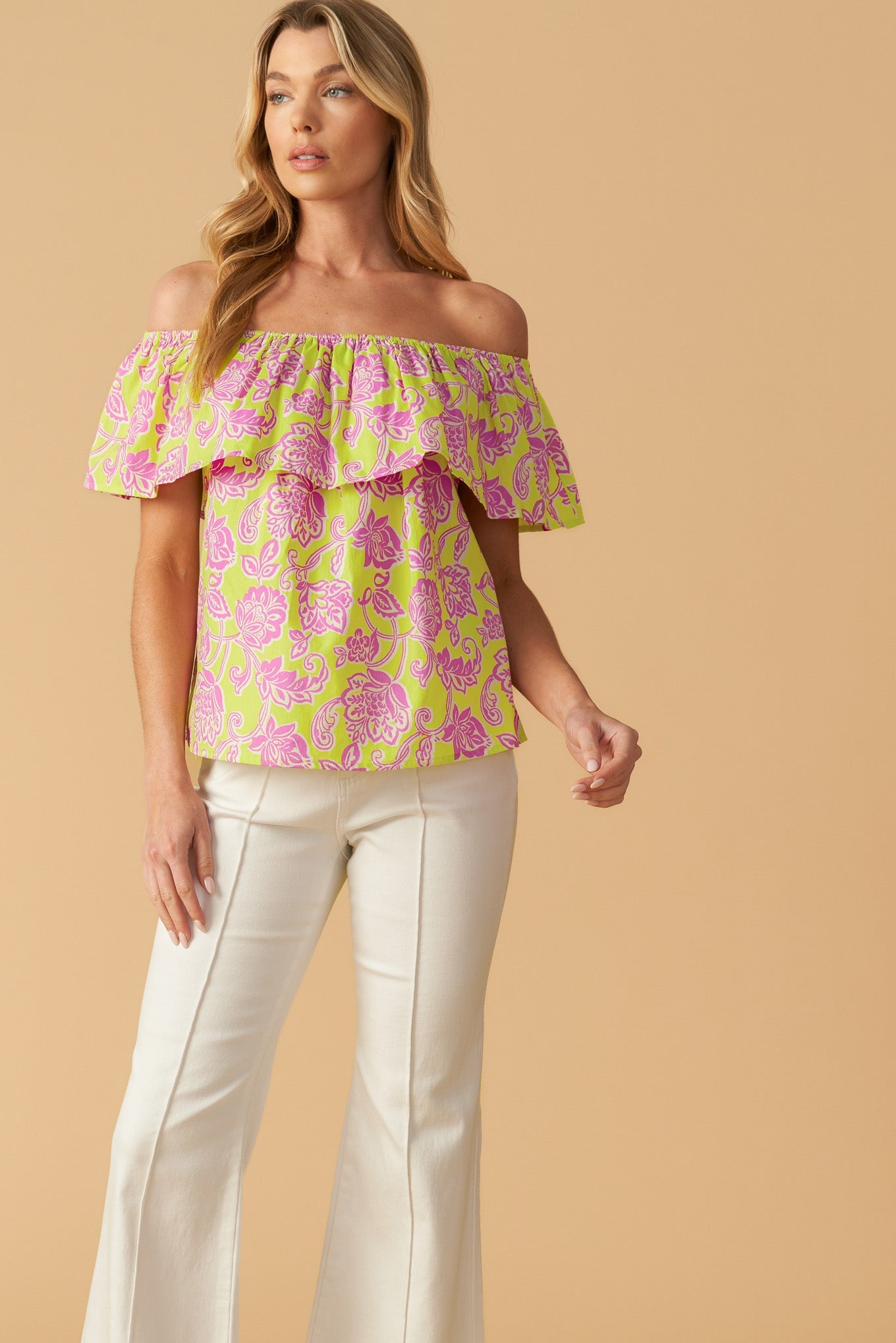 An elegant and exclusive woven blouse, adorned with an off shoulder neckline and flouncy details.