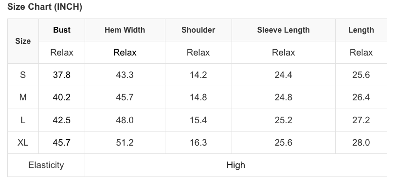 See size chart for approximate measurements