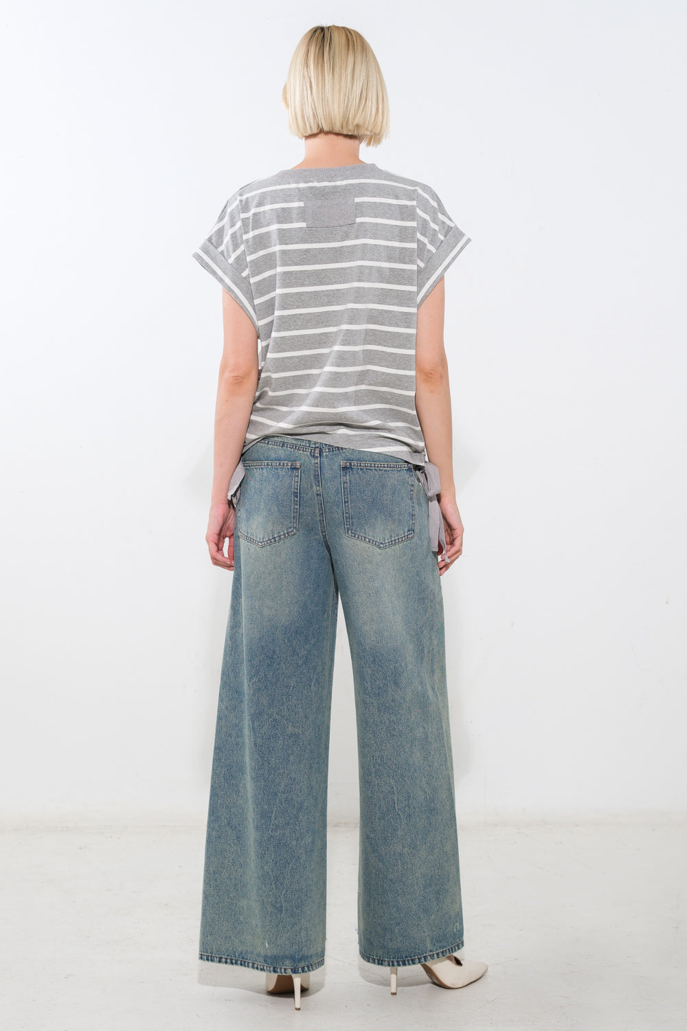 A striped knit top featuring round neckline, short sleeve and side ruching with tie detail
