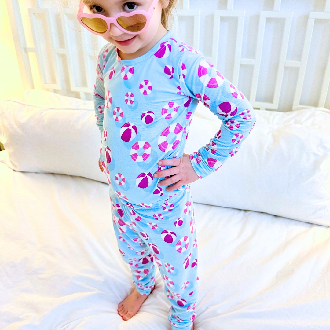 Upgrade your toddler's sleepwear with our super soft bamboo two-piece set! Our Pool Party Pink pajama set is inspired by pool party fun in the Hamptons. We love the pool blue background with bright pink and purple pool floats. Make a splash with your little one’s sleepwear!