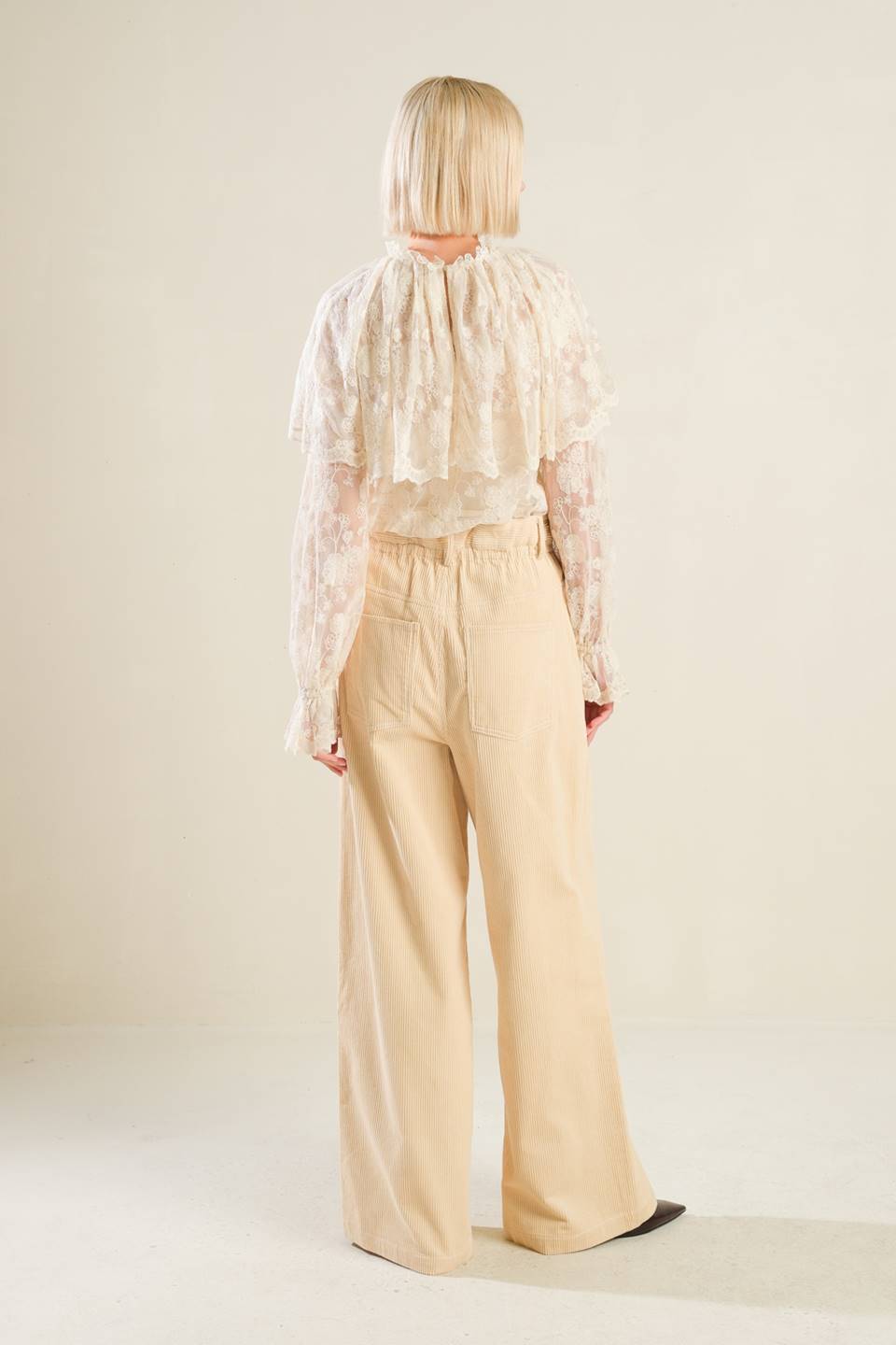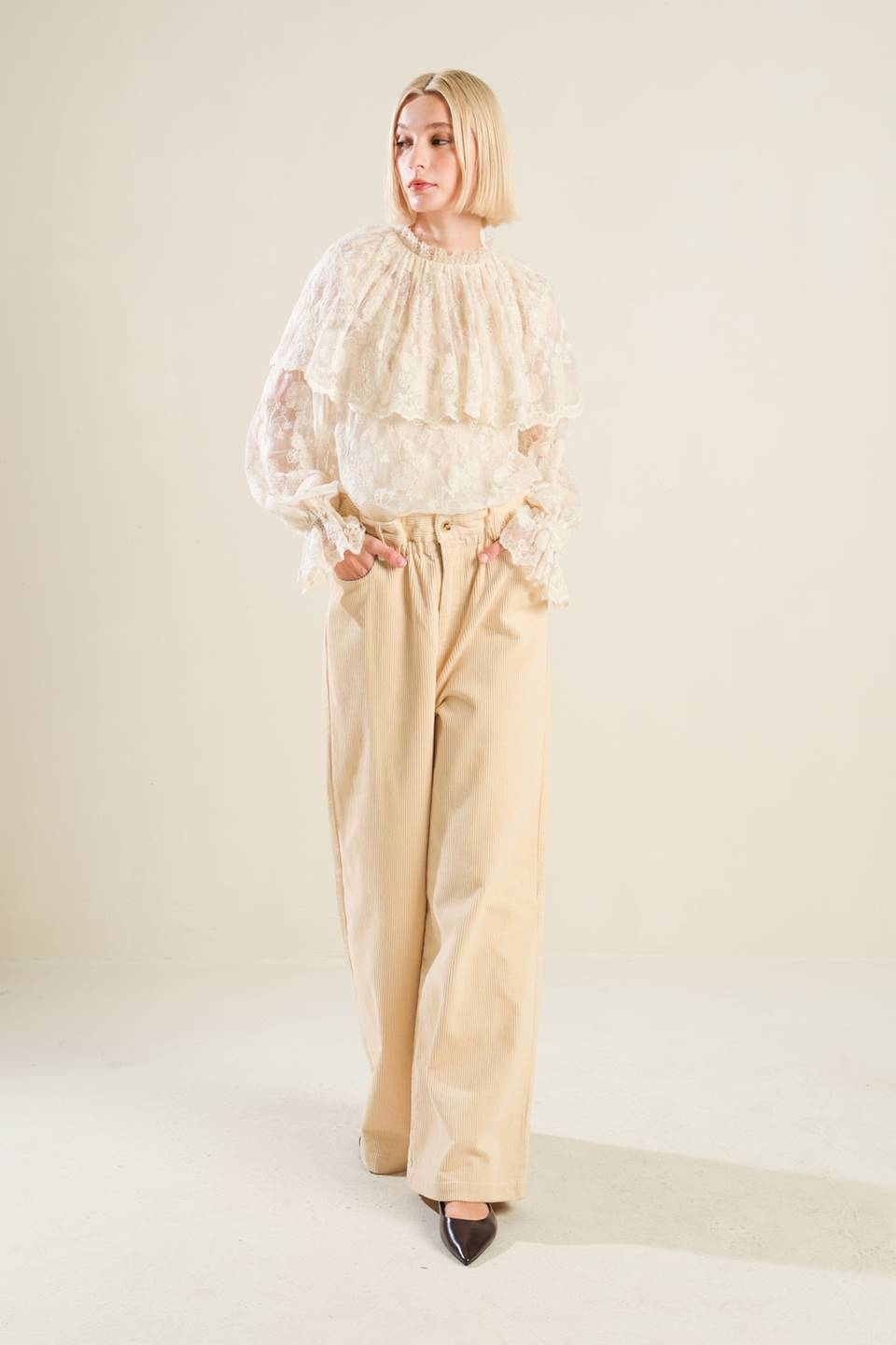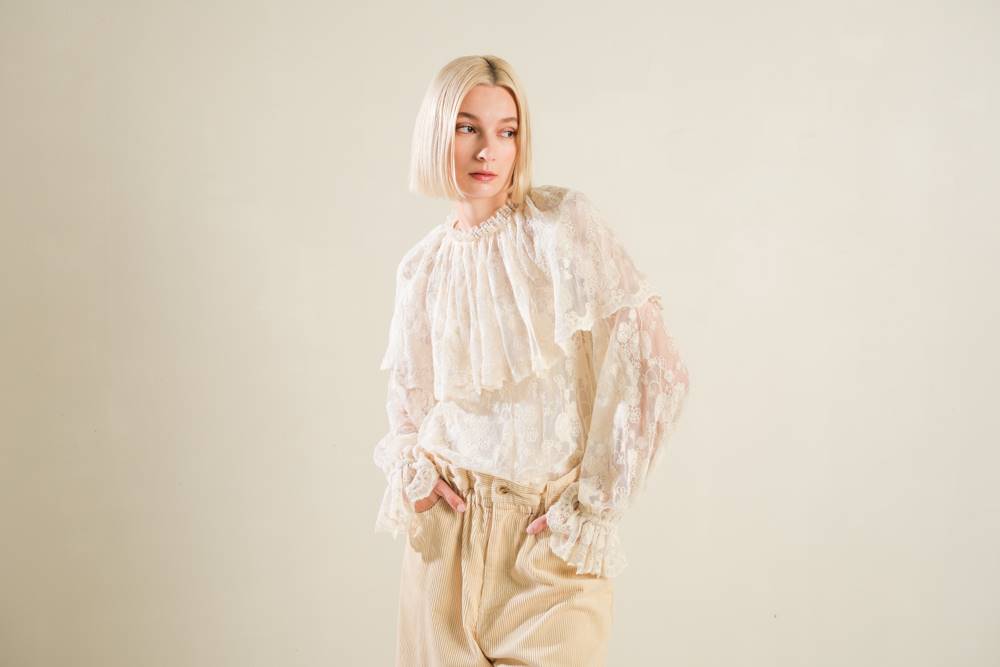 A woven lace top with laced edge neckline, long sleeve and back neck button closure