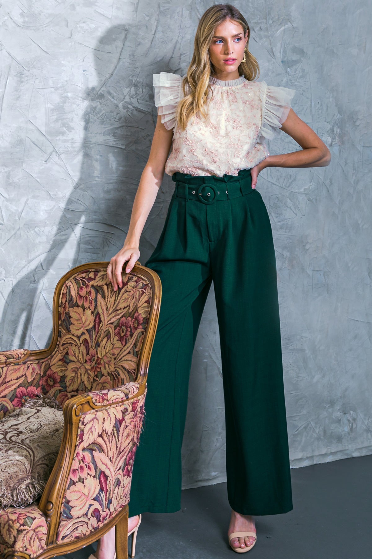 The HOLD ME NEAR WOVEN TOP is the perfect top for any occasion. Crafted from a lightweight woven fabric, this modern design features a ruffled neckline, doubled flutter sleeve and back neck button closure for a secure and comfortable fit. This top is sure to keep you looking chic and stylish for any event.