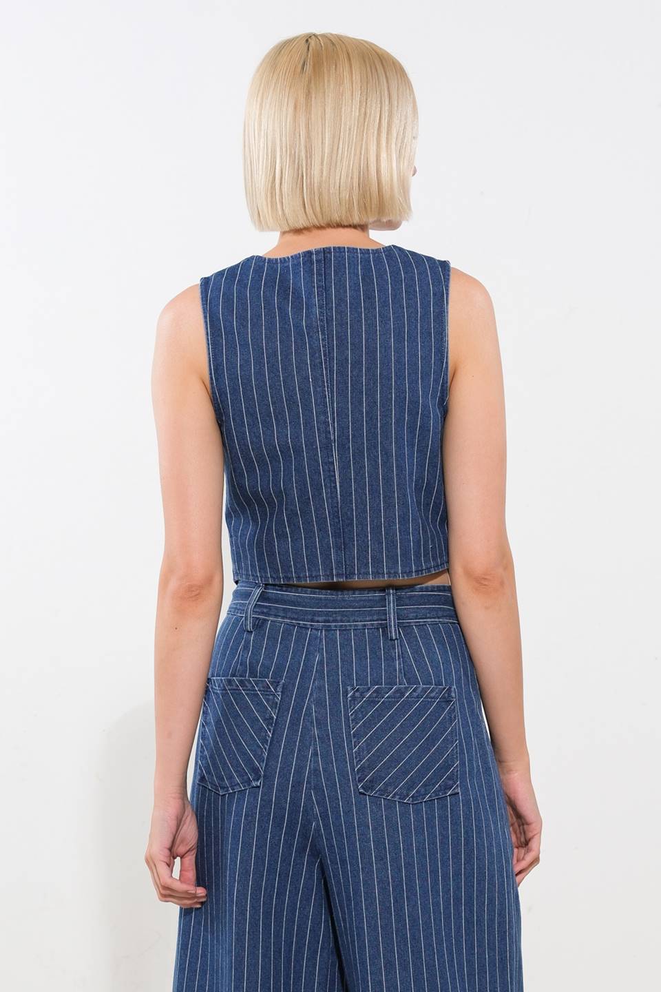 A striped denim vest featuring V neckline, button down and faux pockets. Matching pants FP1319