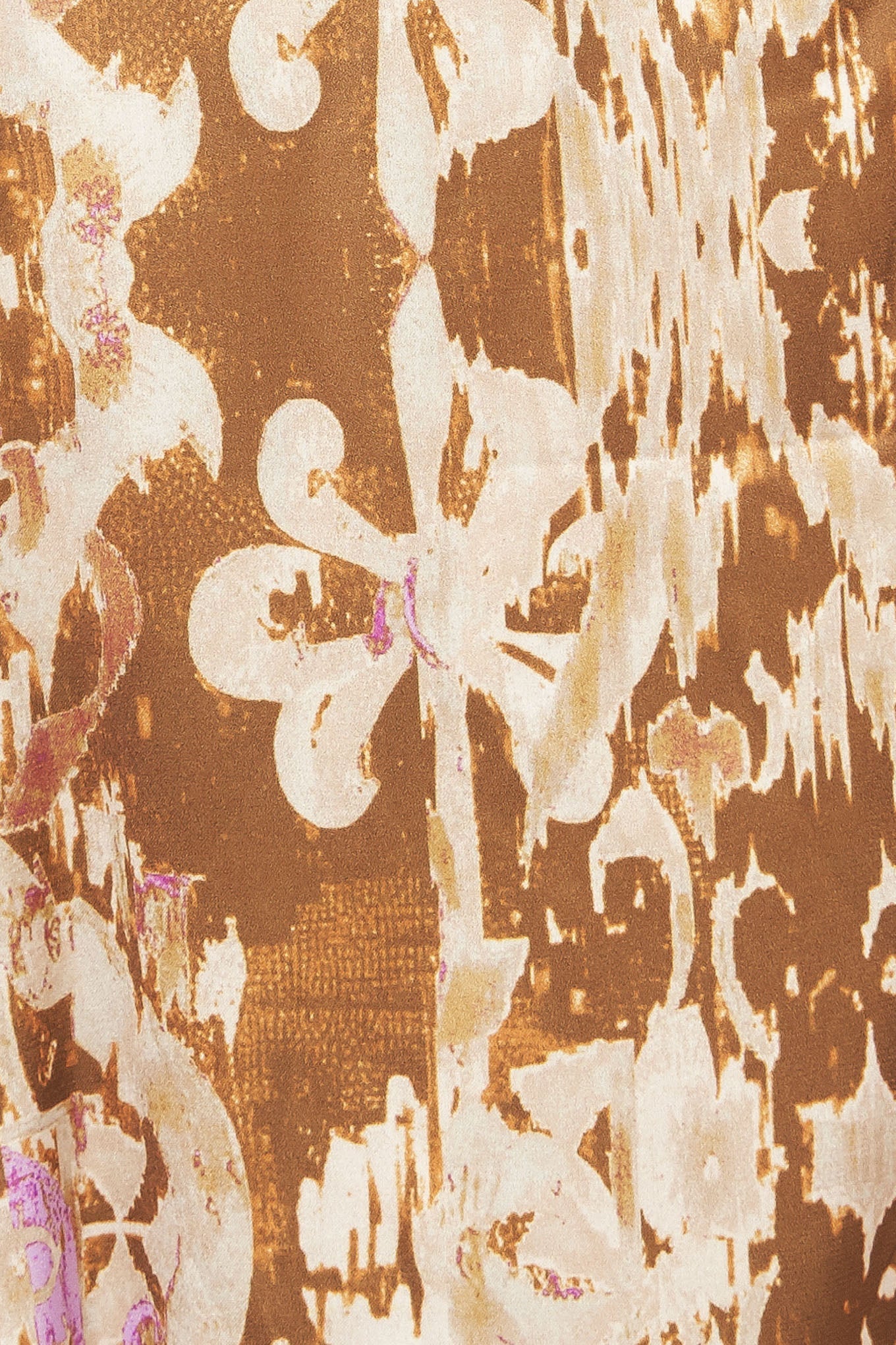 A printed woven midi true wrap dress featuring surplice neckline and long sleeve with smocked cuff