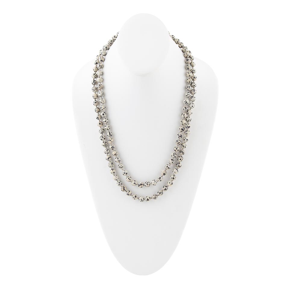 This handcrafted necklace is crafted with Dalmatian Jasper Beads, measuring 25 inches long and .25 inches at its widest point. Each bead was thoughtfully chosen for its unique qualities, resulting in a total weight of 93.3g. Feel the natural beauty and energy of this necklace as it rests against your skin.