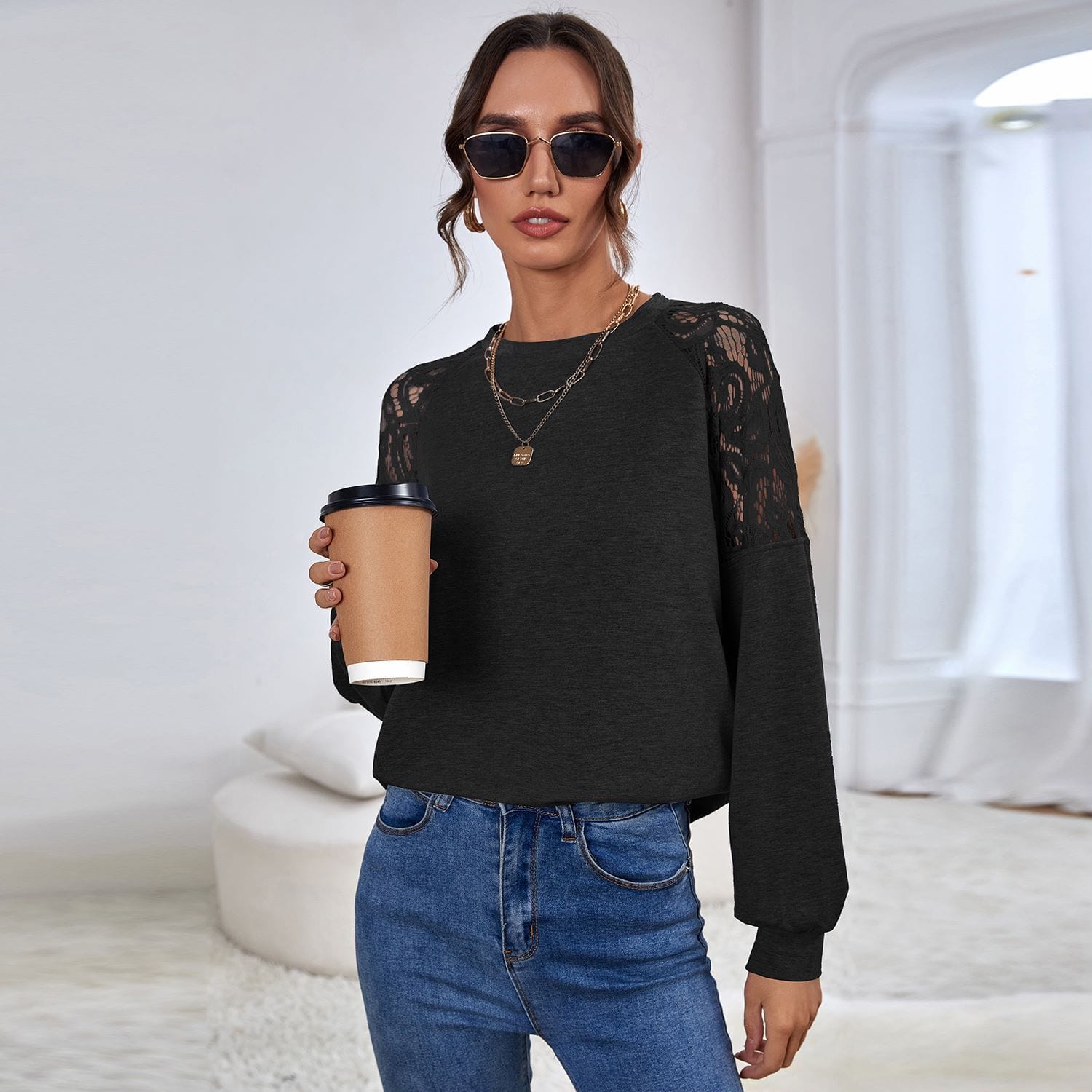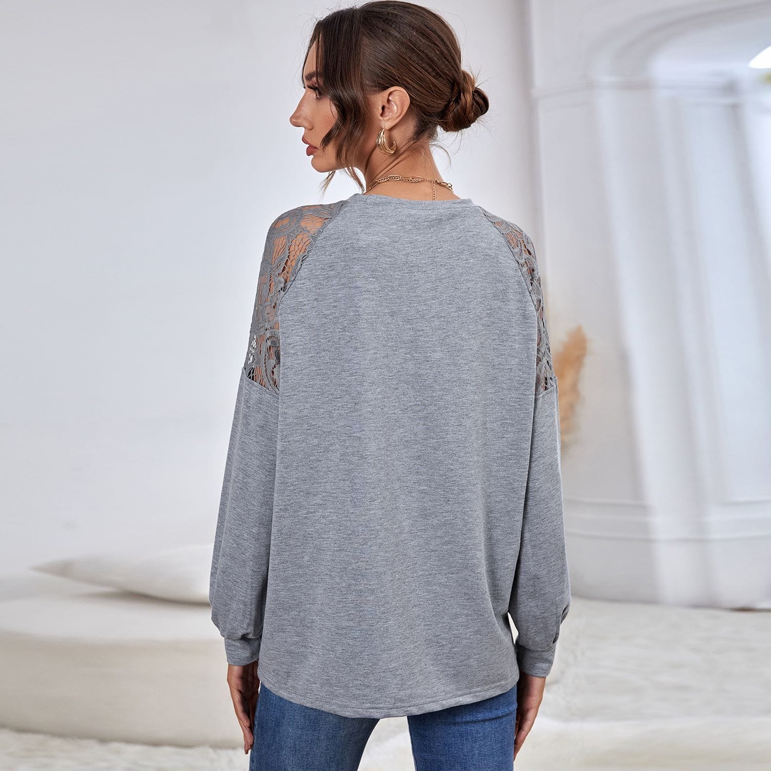 ??he Anna-Kaci sweater is detailed with dainty lace details on the shoulder and sleeves. Features a round neck line, long raglan sleeves, and loose fit. Pair it with denim jeans and sneakers for a pretty look.