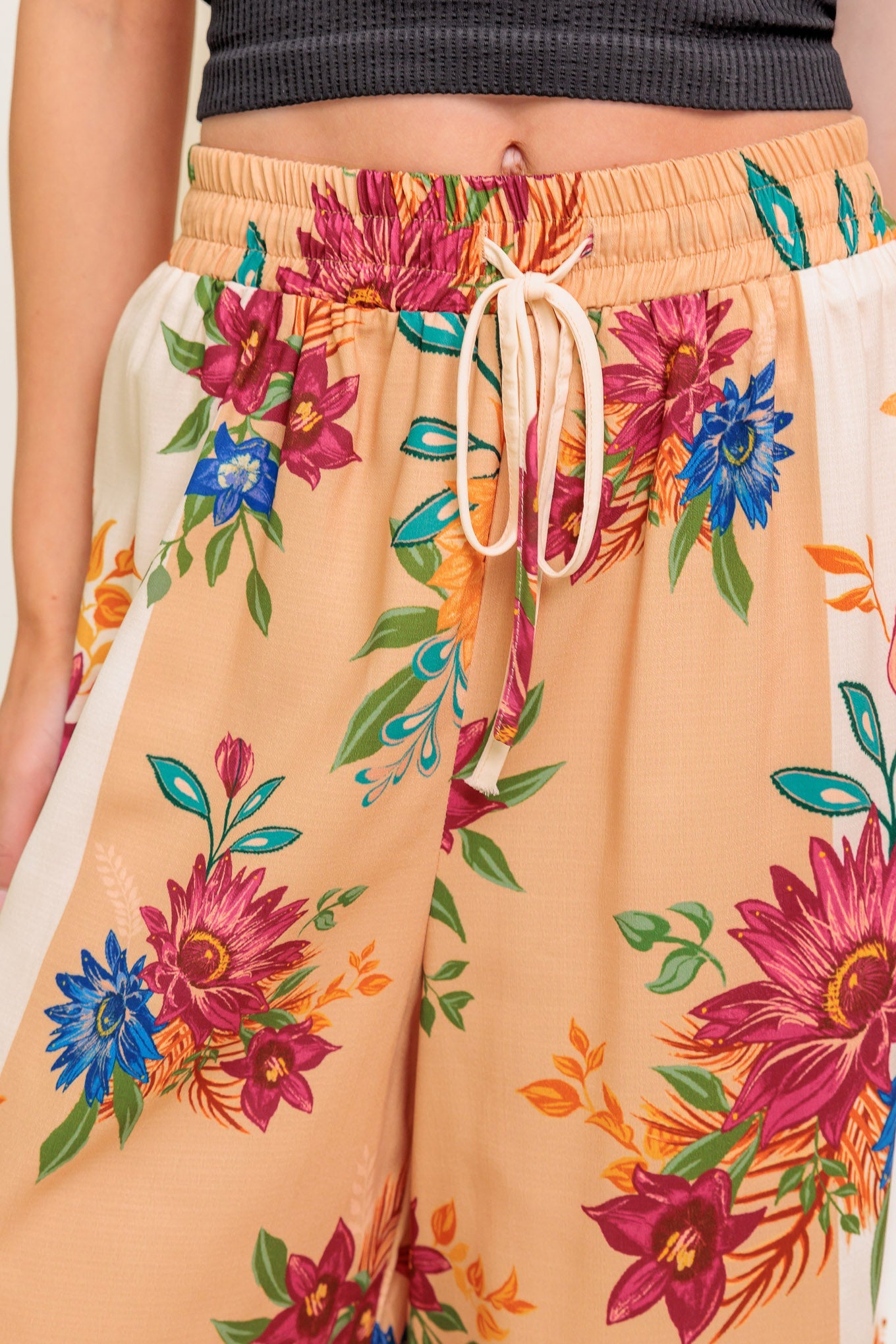 A printed woven pant with elasticized waist and tie. Matching top IT13204