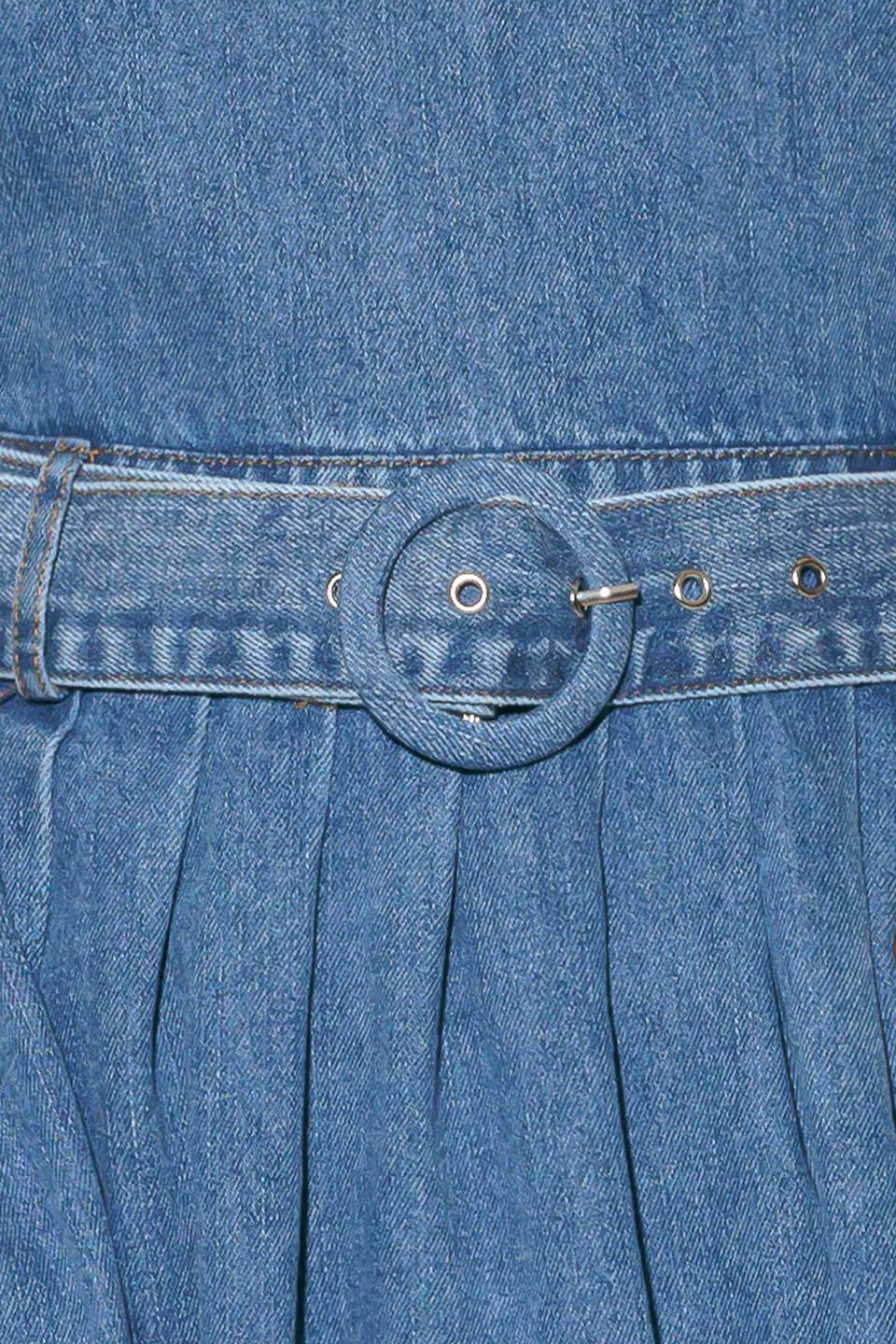A washed denim midi dress featuring boat neckline, sleeveless, self belt, full skirt, side pockets, bare back, adjustable strap and back button down closure