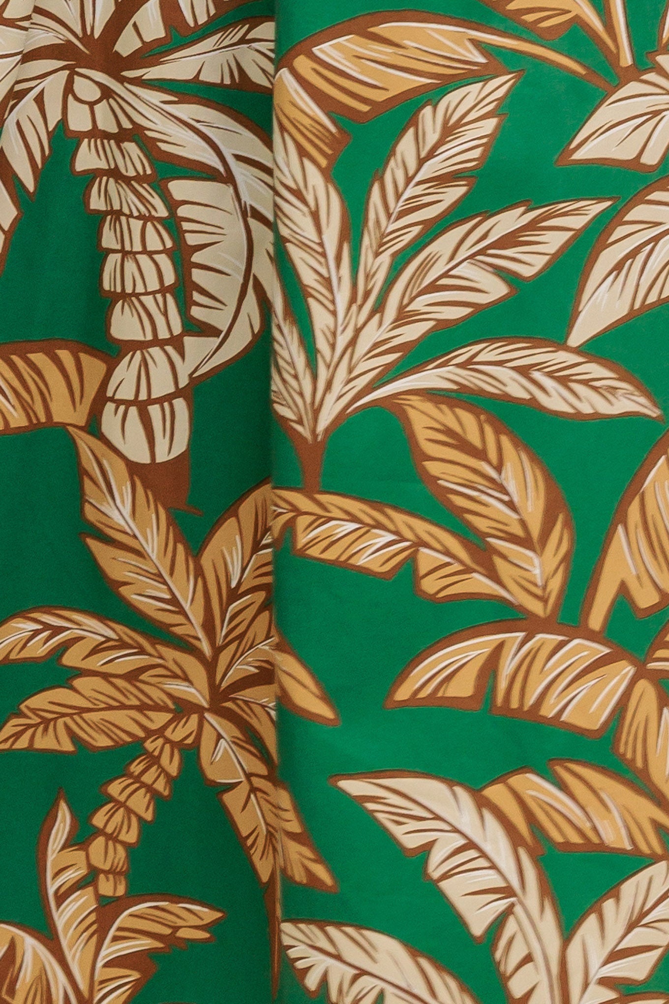 A printed woven midi dress featuring V neckline, dropped shoulder, smocked wide waistband and front zipper closure