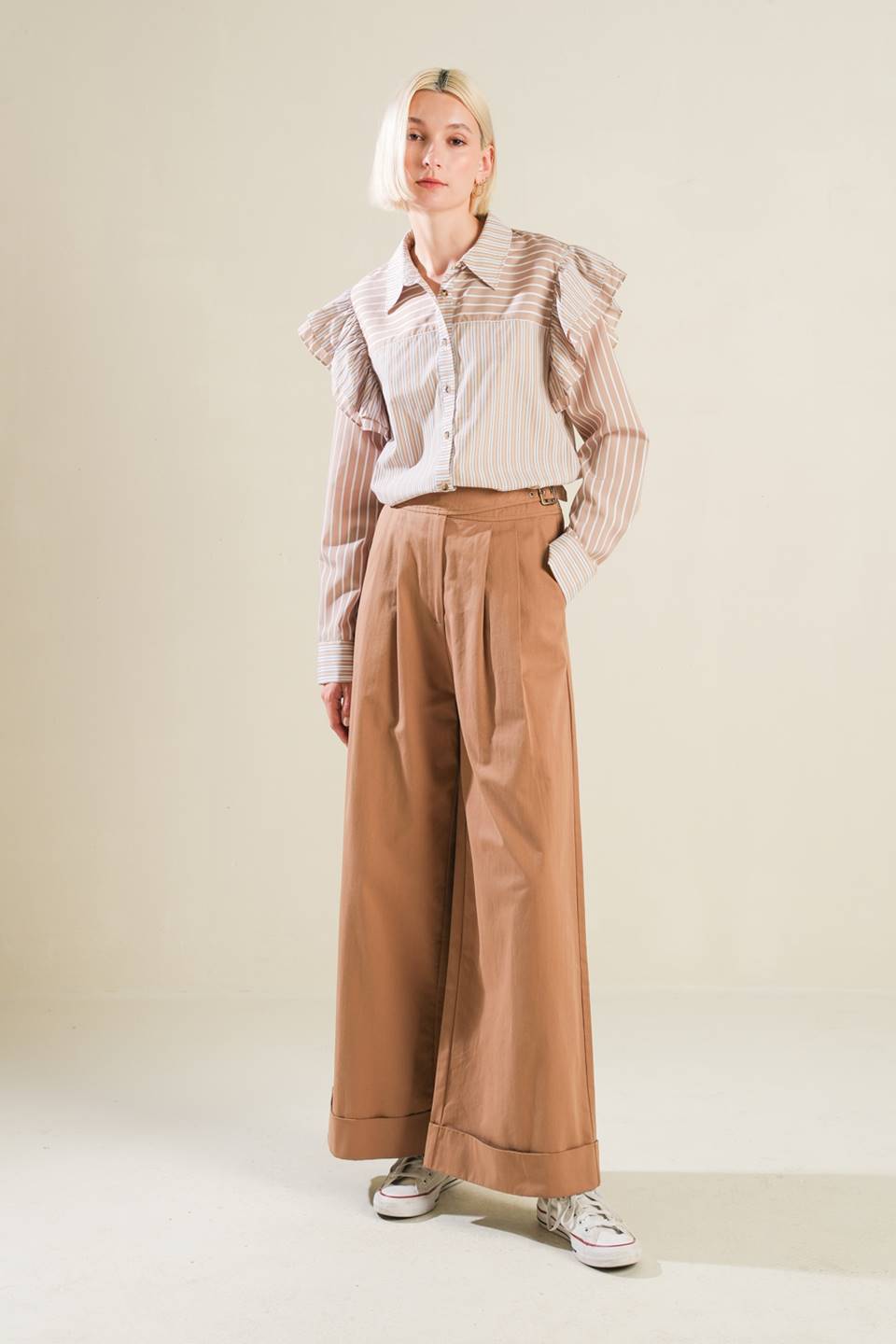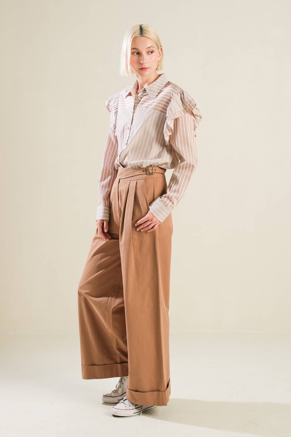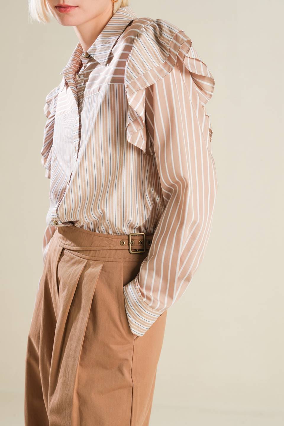 A striped woven top featuring shirt collar, button down, ruffle over shoulder and long sleeve