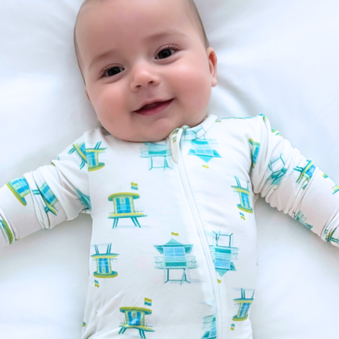 Upgrade your baby's sleepwear with our super soft bamboo zippered romper! Our Beach Watch Blue zippered romper is inspired by the iconic lifeguard towers of Miami Beach. This bright blue, teal and green lifeguard tower sits on a clean white background! Our top selling baby shower and birthday gift, give the gift of a good night's sleep!