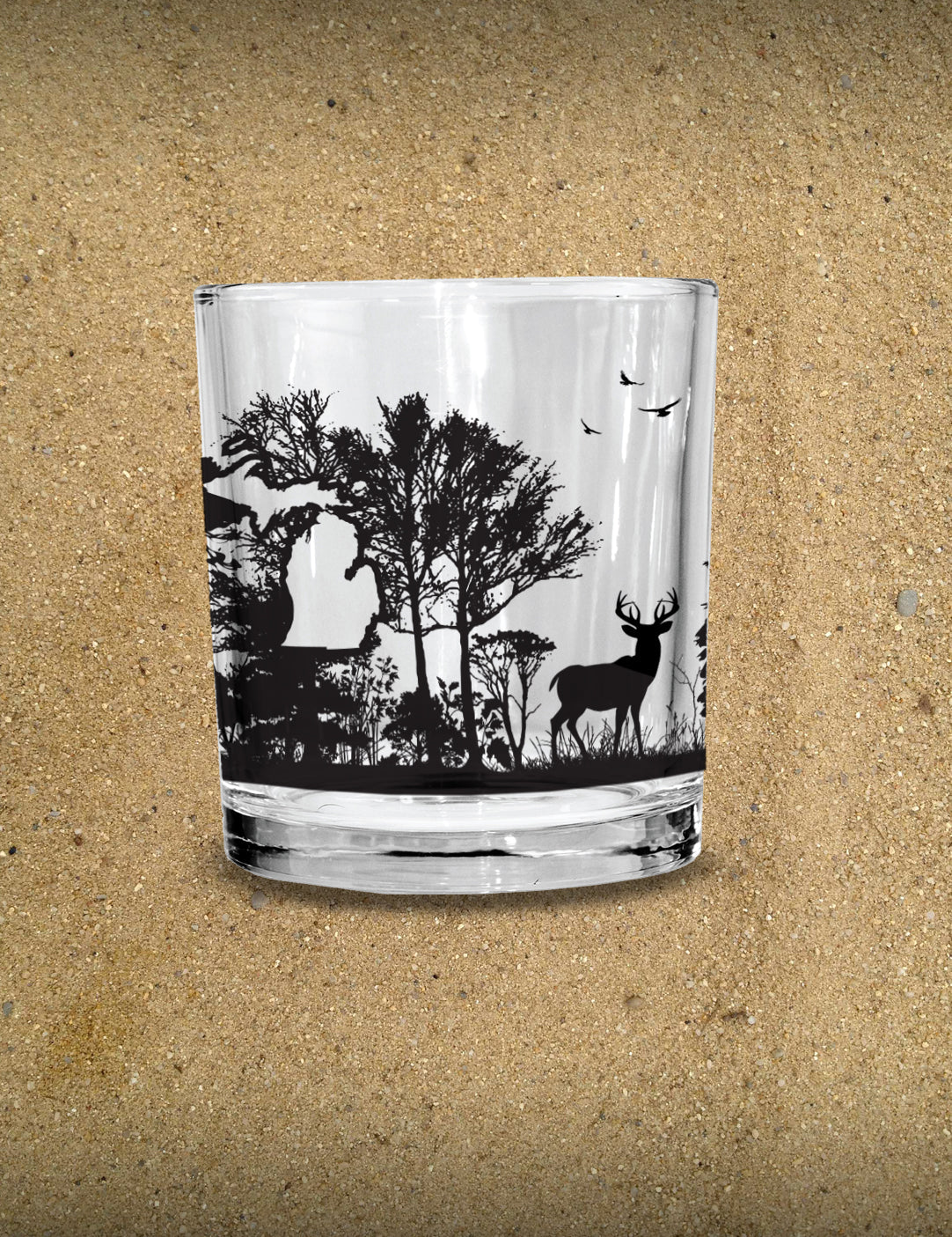 This screen printed bourbon glass feature a rustic forest landscape with a Michigan located right in the middle of it! This whiskey glass is the perfect addition to any kitchen out in the woods!