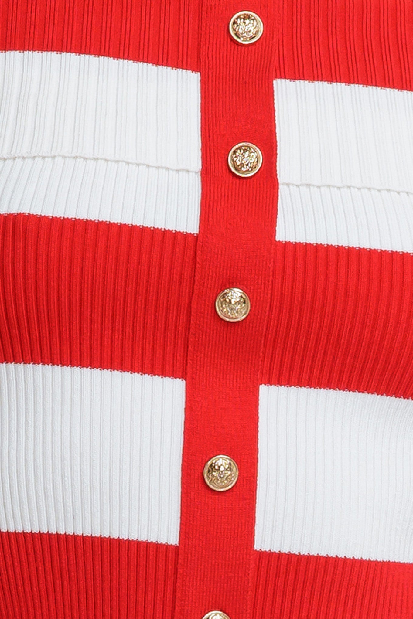 A red and white striped sweater knit crop top featuring off shoulder neckline and button down detail