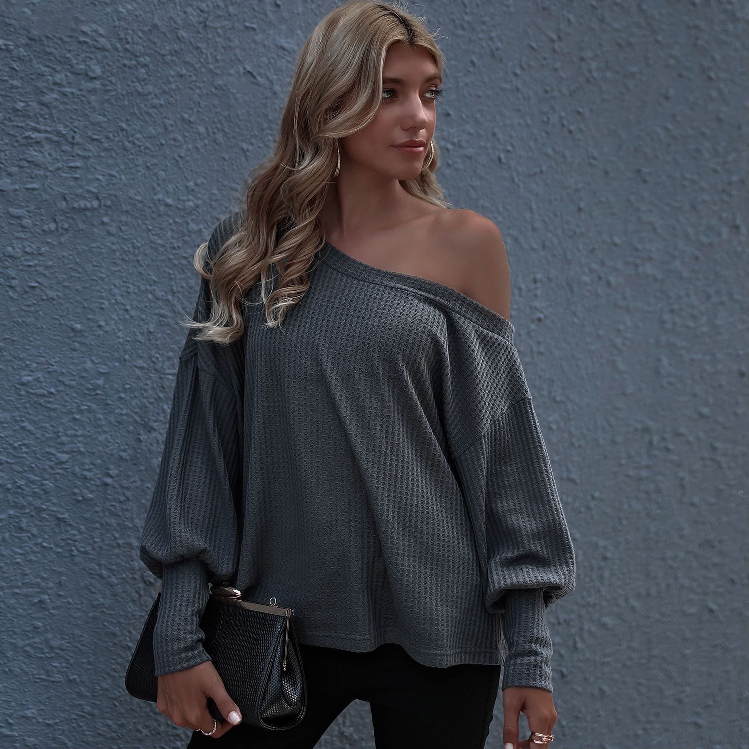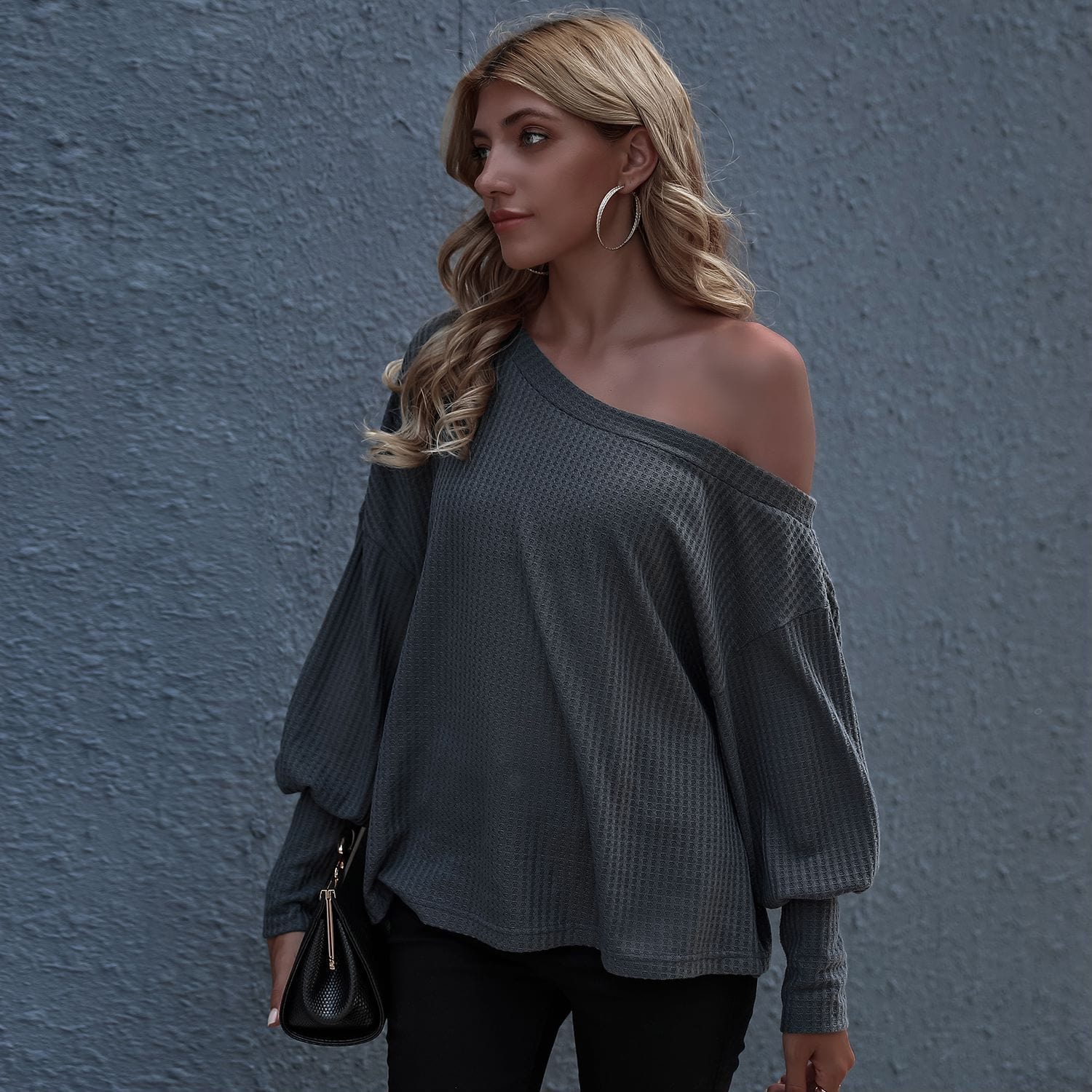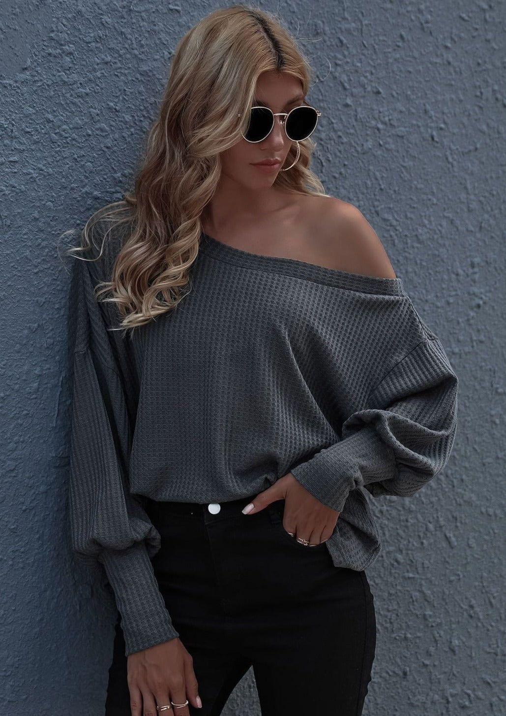 ??he Anna-Kaci sweater is detailed with a sexy one shoulder neck line. Features solid color, bishop sleeves, waffle knit material, and loose fit. Pair. it with black jeans and sneakers for a cozy fall look.