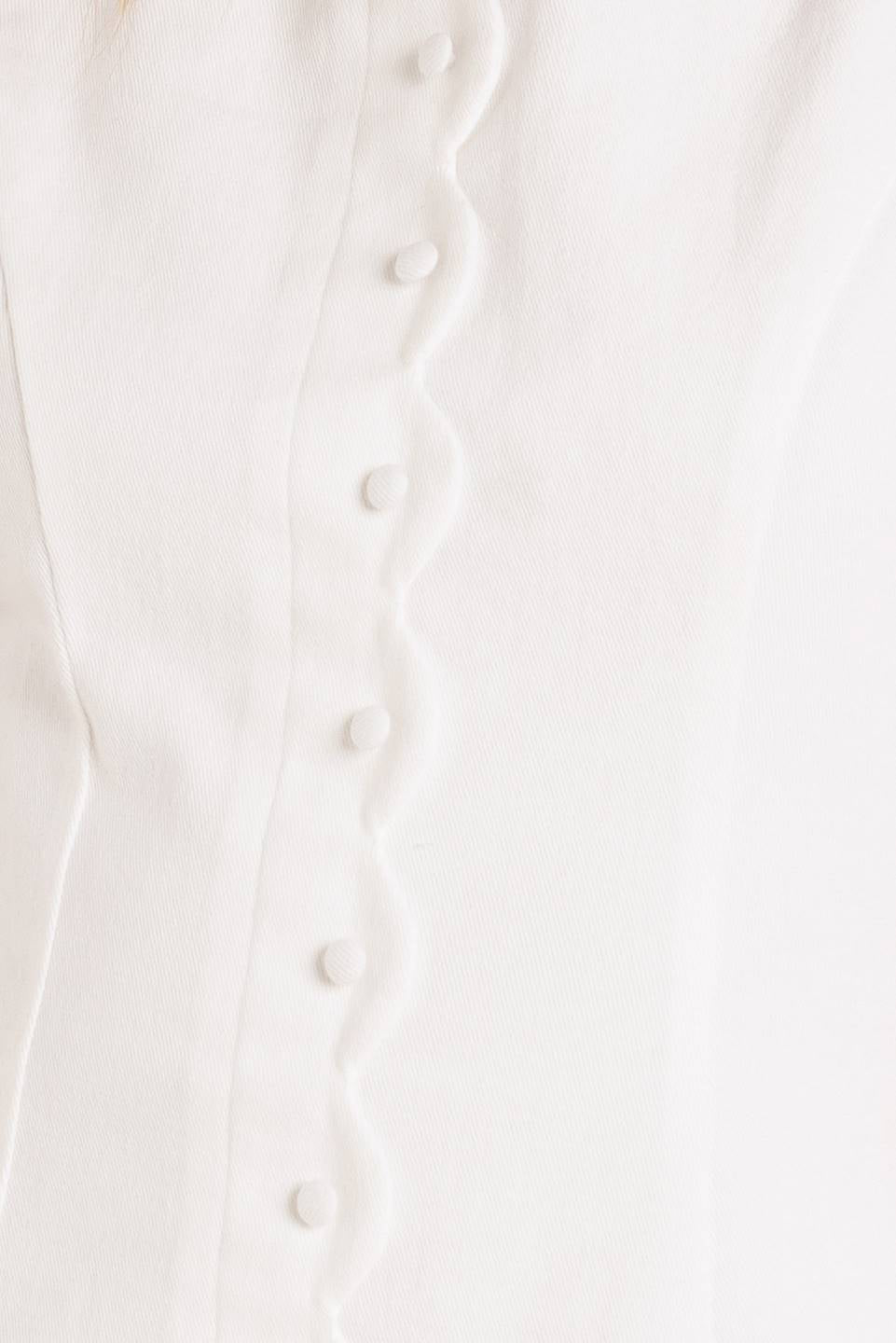 This solid woven mini dress boasts a refined round neckline, elegant sleeveless design, and a non-functional button down with a delicate scallop placket. Finished with a drop waist, full skirt, and back zipper closure, this dress exudes sophisticated charm.