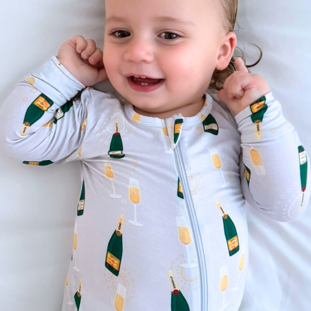 Upgrade your baby’s sleepwear with our super soft bamboo zippered romper! Our Paris Champagne pajama set is inspired by celebrating life’s little moments. We love the soft gray background with the rich green and gold champagne bottle details. Whatever it is you’re celebrating today, we cheers to you!