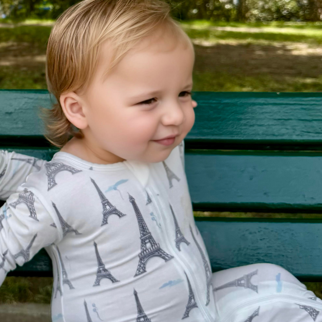 Upgrade your baby’s sleepwear with our super soft bamboo zippered romper! Our Paris Eiffel Tower pajama onesie is inspired by the iconic Eiffel Tower in Paris, France. We love the gender neutral slate gray design with the subtle pale blue balloons and cloud details. Say goodnight and au revoir, as your little one drifts off to sleep dreaming of Parisian adventures.