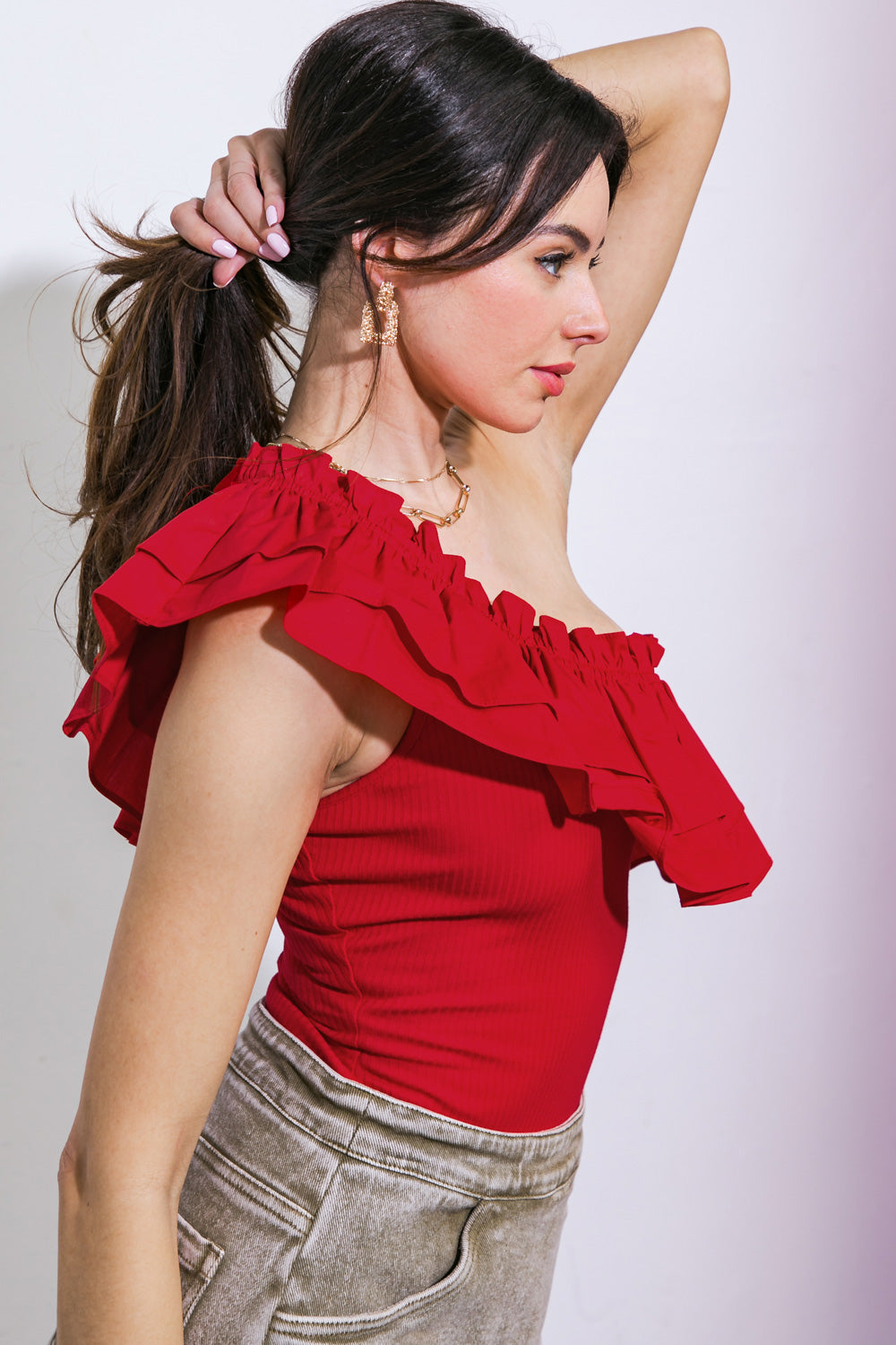 The PERFECT VOYAGE BODYSUIT is perfect to take on your next voyage. This solid bodysuit offers a one shoulder neckline and ruffled flounce for all day comfort and style. Expertly crafted and designed, this bodysuit adds effortless elegance to any outfit.