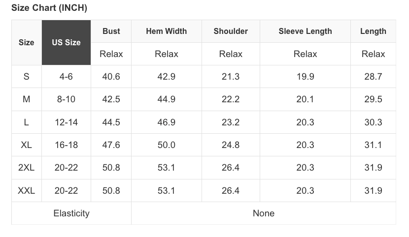 See size chart for approximate measurements