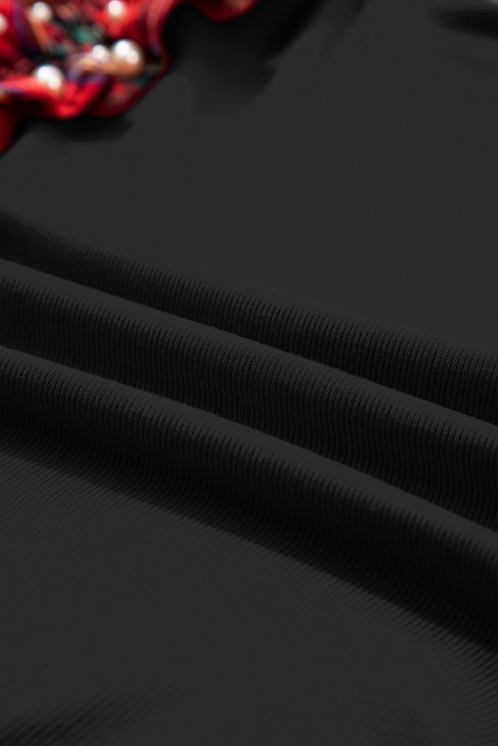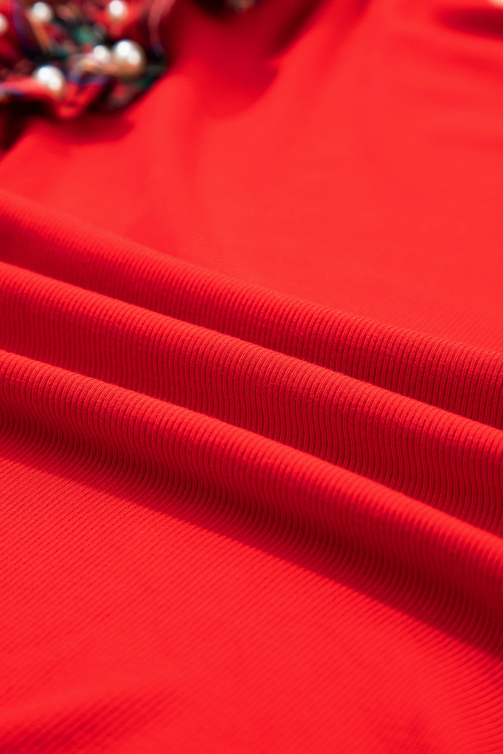 Elevate your holiday wardrobe with this T-shirt. Crafted from lightweight, non-sheer fabric, it ensures comfort without compromising style. The fine ribbed texture adds subtle dimension, while the sleeves and delicate pearl accents offer sophisticated festive details. Perfect for celebrations, this top combines elegance and ease, making it a versatile choice for any seasonal occasion. Viscose/Spandex