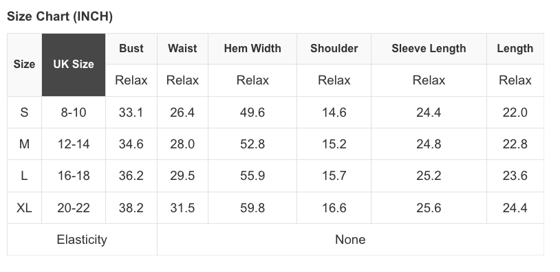 See size chart for approximate measurements
