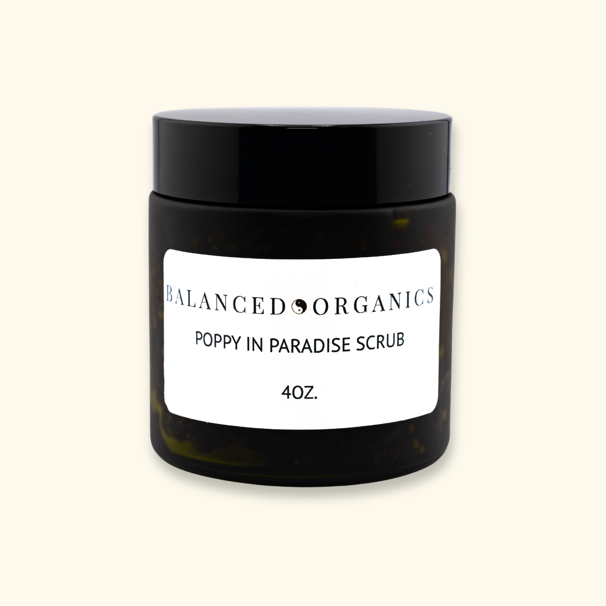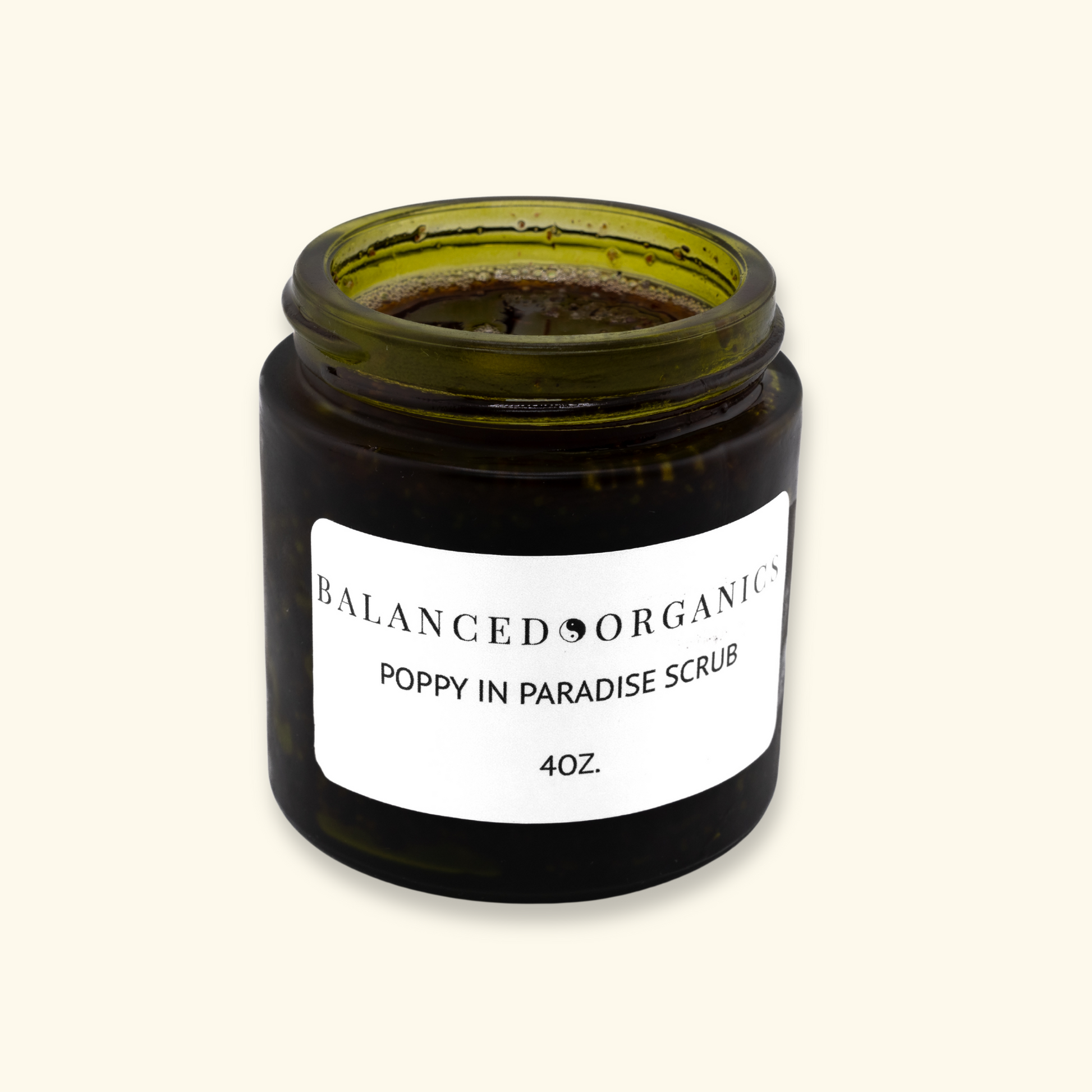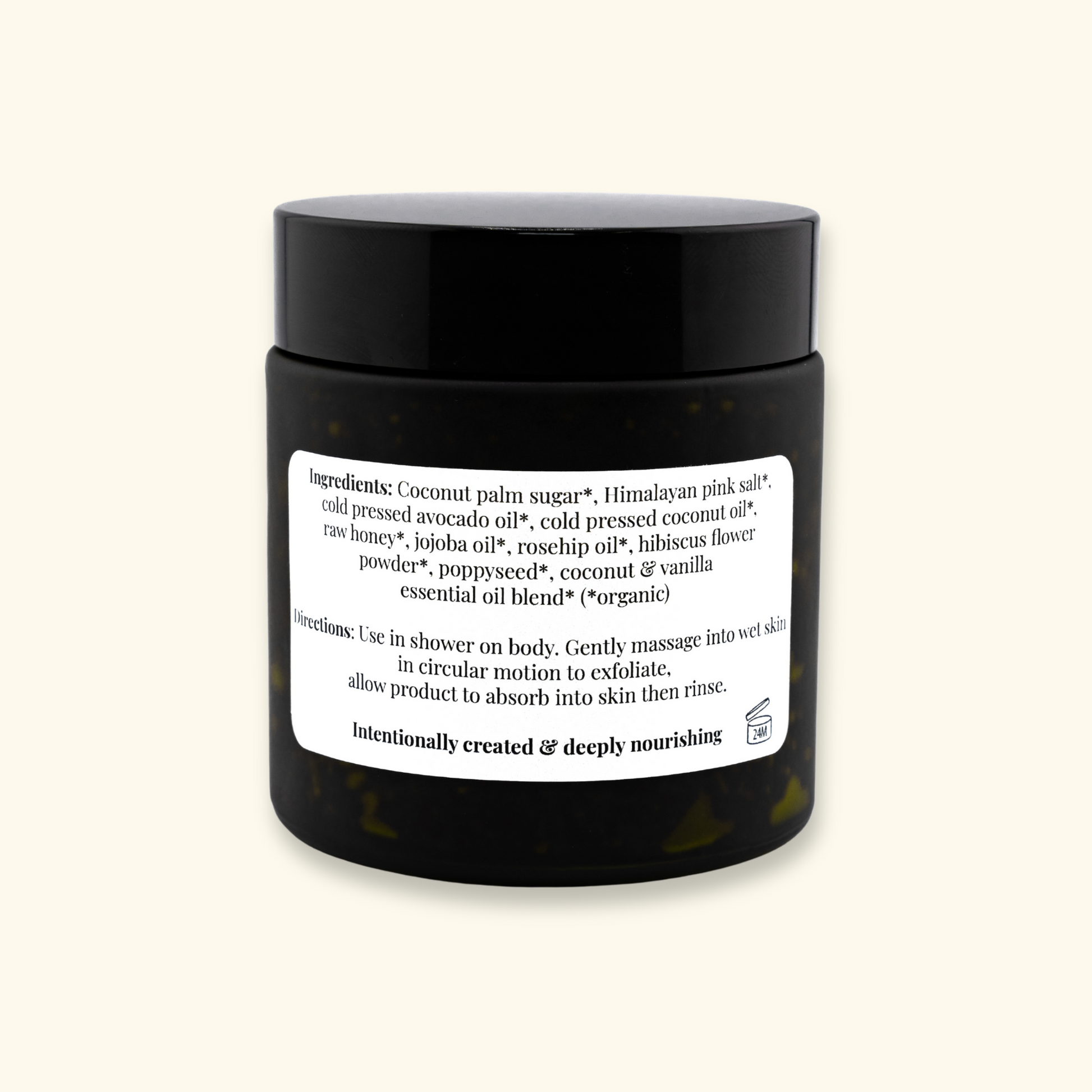 Ingredients: Coconut palm sugar*, Himalayan pink salt, cold pressed avocado oil*, cold pressed coconut oil*, raw honey*, jojoba oil*, rosehip oil*, hibiscus flower powder*, poppyseed*, coconut & vanilla essential oil blend* (*organic)